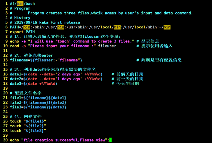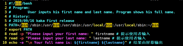 2、第二,三行是对整个程序的说明,除了第一行的#!是用来宣告shell的之外,其他的#都是注解的用途