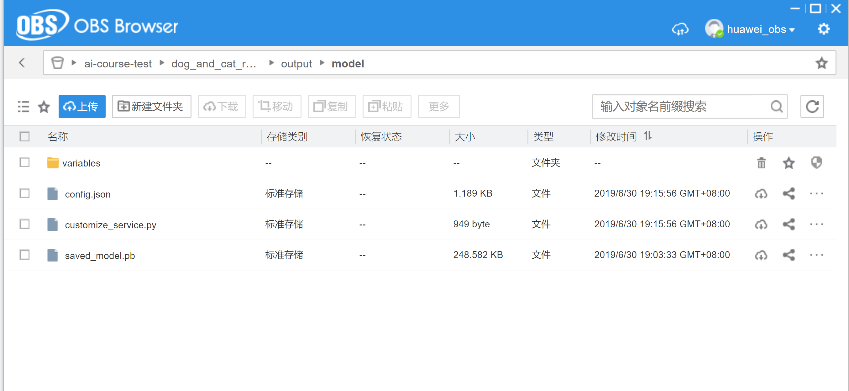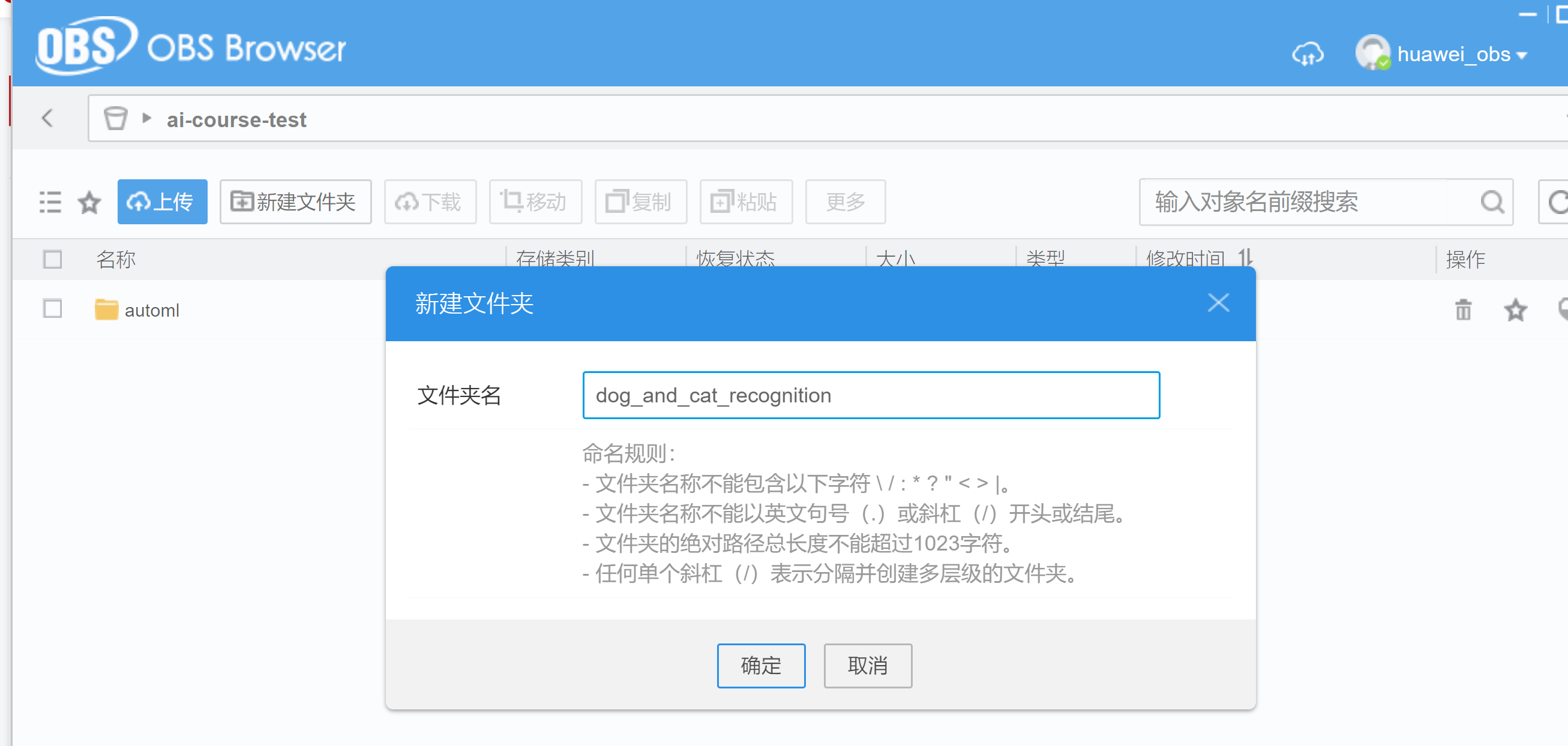 步骤 2 使用OBS Browser上传文件夹dog_and_cat_200至OBS路径/ai-course-001/dog_and_cat_recognition/下(其中,ai-course-001是OBS桶名,在创建OBS桶的时候可以自己定义桶名,dog_and_cat_recognition是OBS桶下的一个文件夹)。如果OBS桶和路径不存在,需要自己创建。注意:OBS桶名全局唯一,如果创建桶时桶名冲突,需要选择其他桶名。