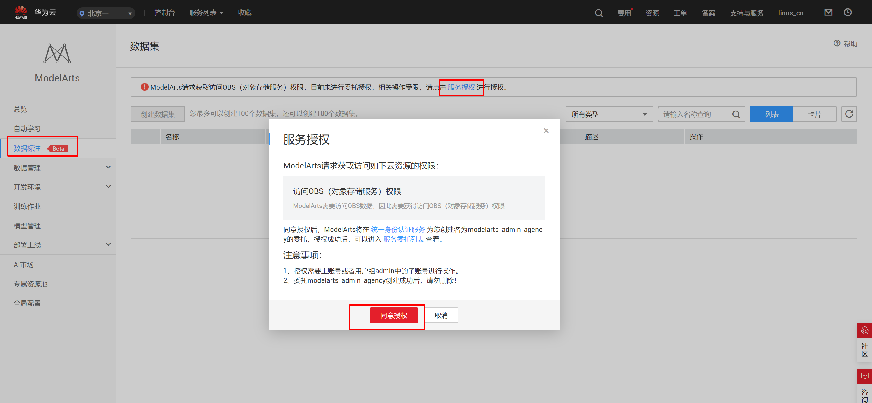 在ModelArts中左侧找到“数据标注”,先做OBS服务授权,如下图所示: