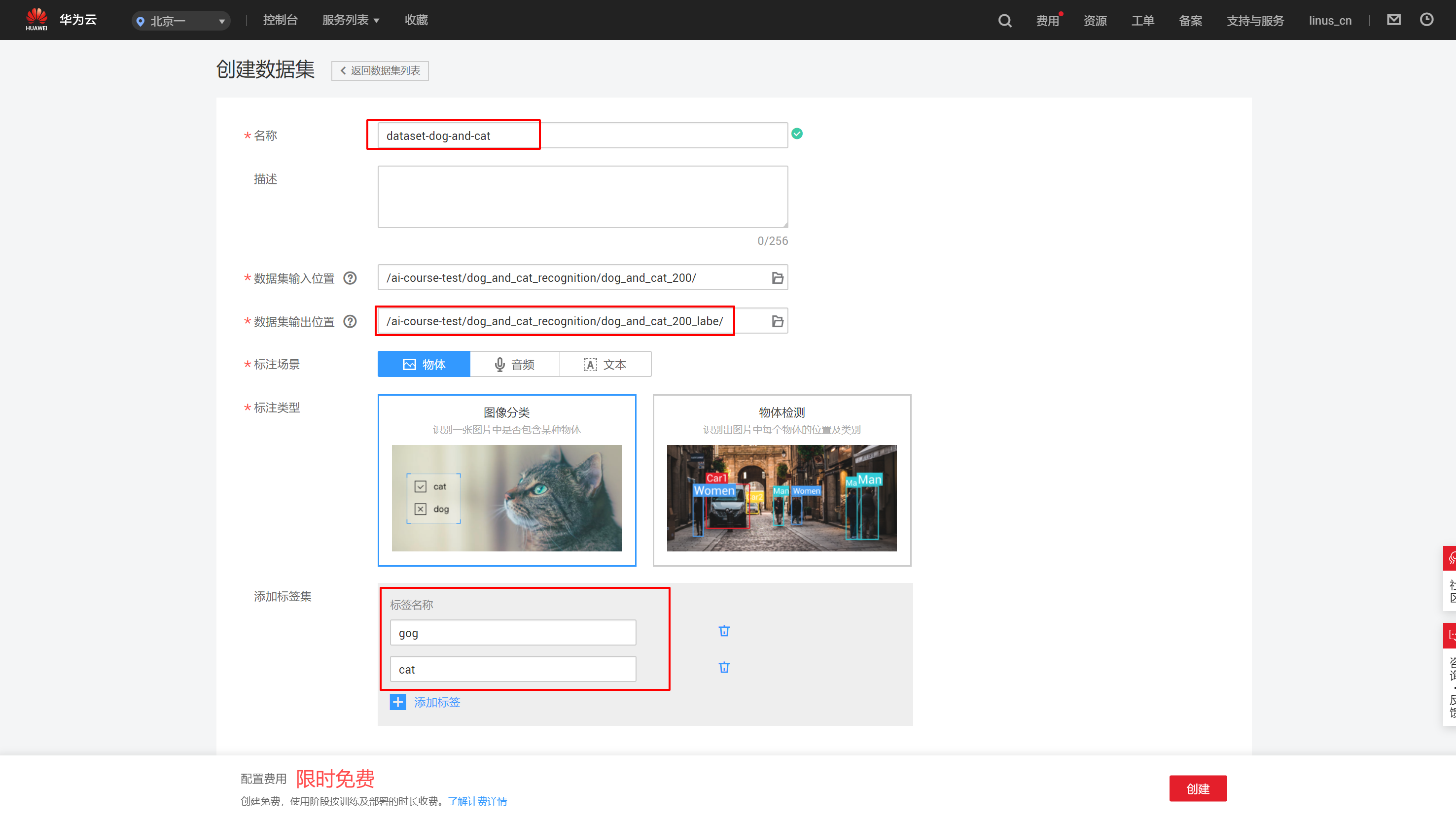数据集输出位置:标注后数据的输出OBS路径。如果不存在,需要自己创建,我当前的是dog_and_cat_200_label,与dog_and_cat_200在同一个文件夹中
