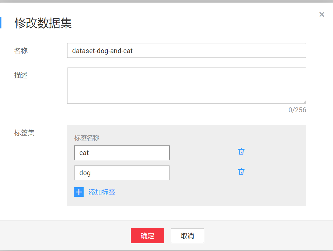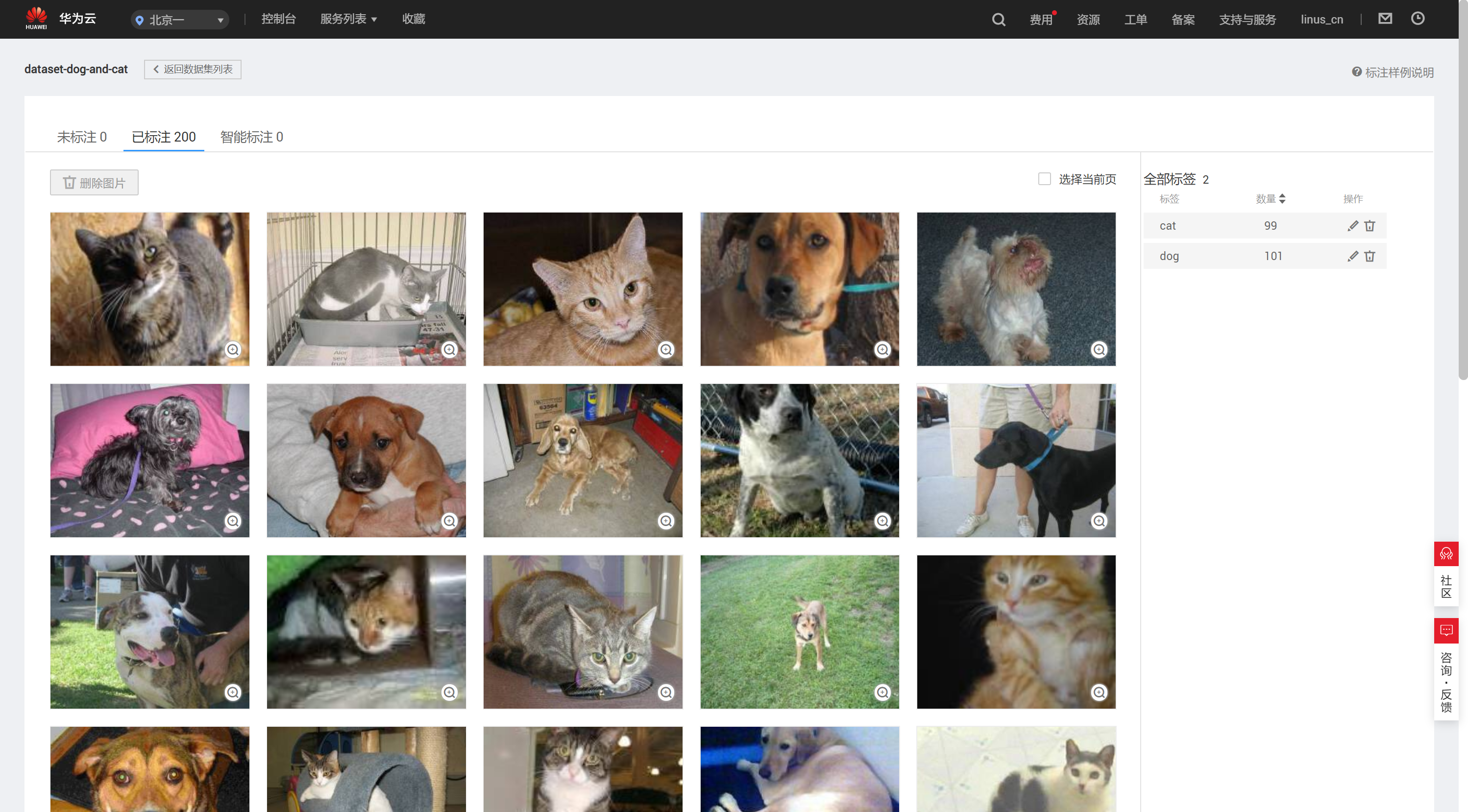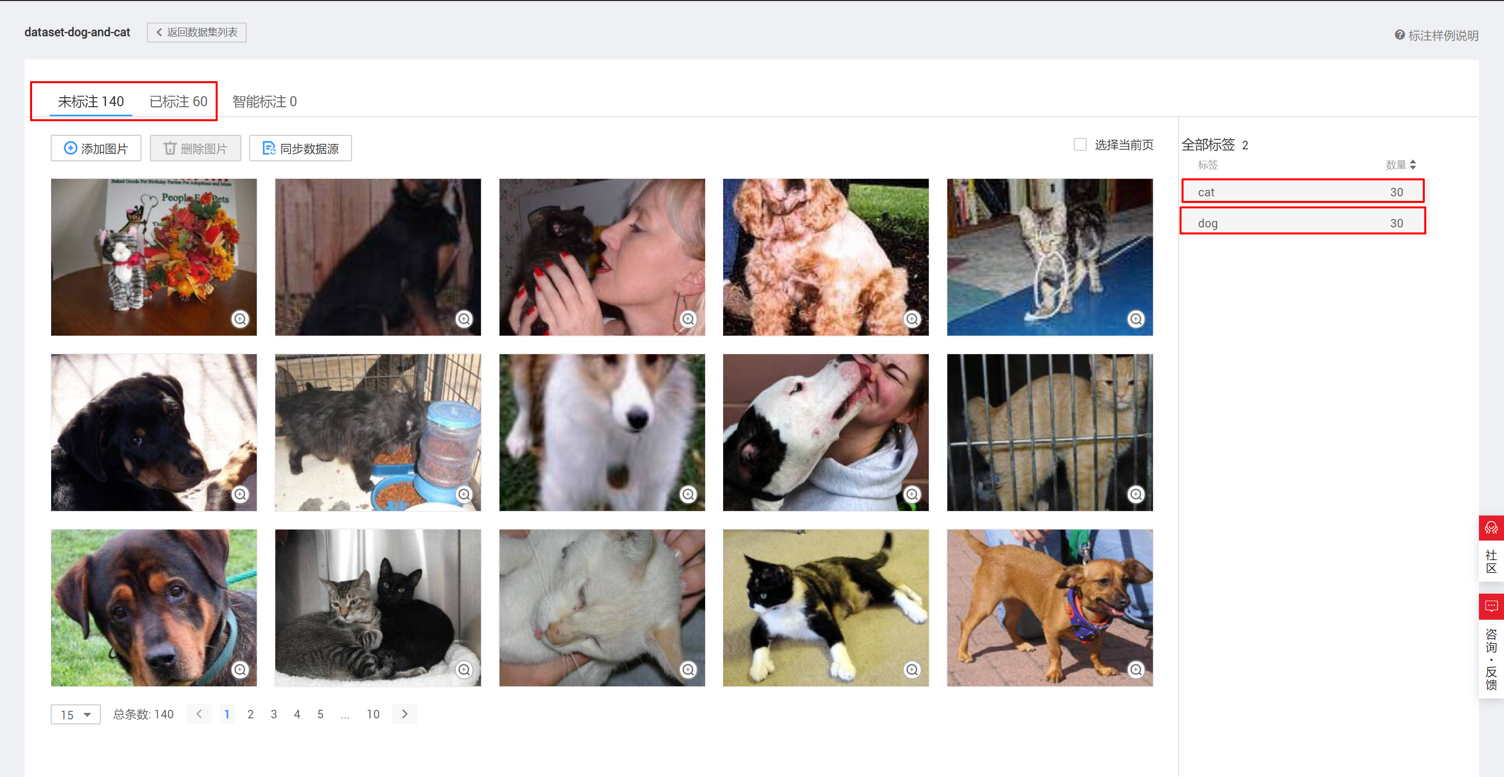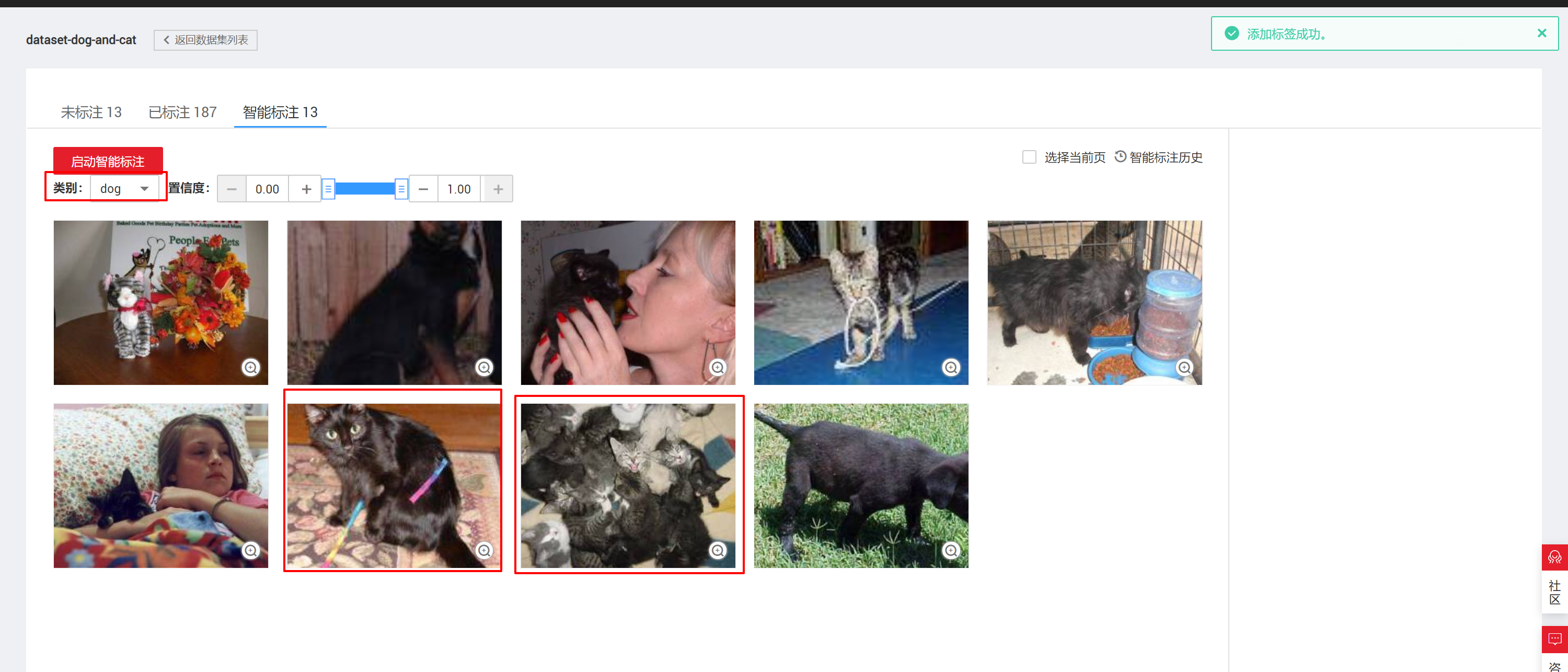点击进入刚刚创建的数据集,手工标注部分数据。我们建议标注猫和狗各20到30张图片,剩余的图片采用智能标注。手工标注的方式参考数据集页面右上角的“标注样例说明”。