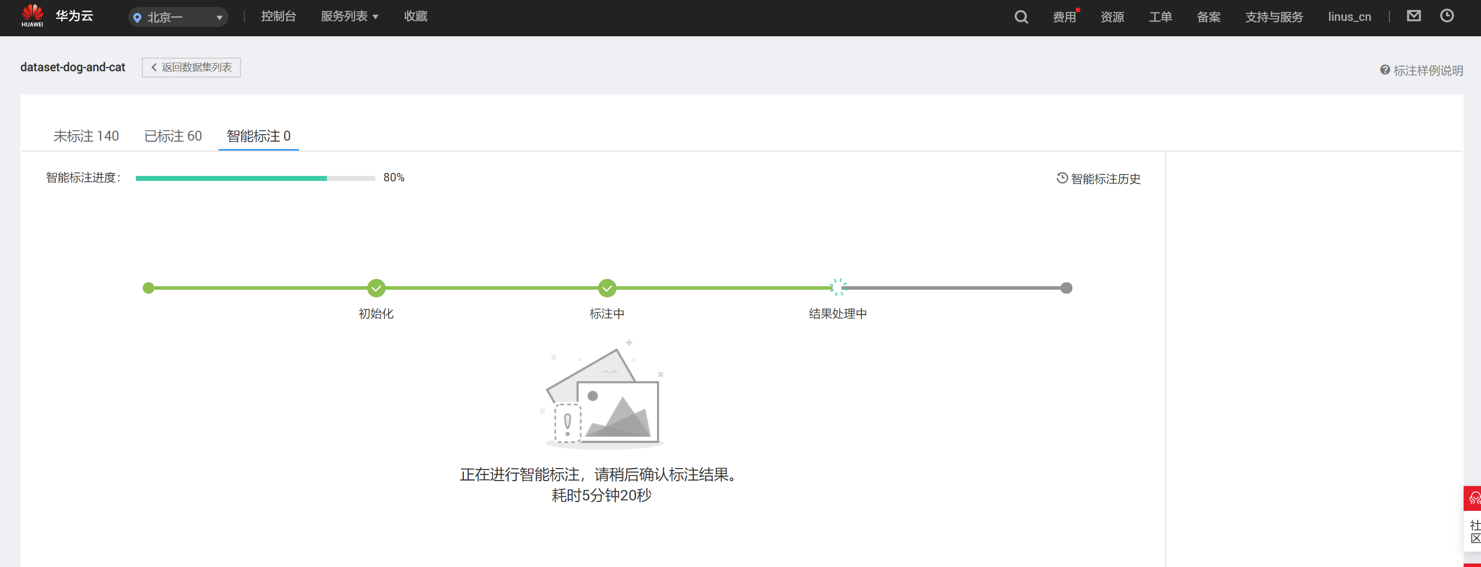 点击“智能标注“页签,然后点击”启动智能标注“按钮。在弹出的对话框中,模型来源选择“自动选择”。然后点击提交。(智能标注作业运行过程预计3到5分钟左右,ModelArts使用高峰期可能会有时间延迟)