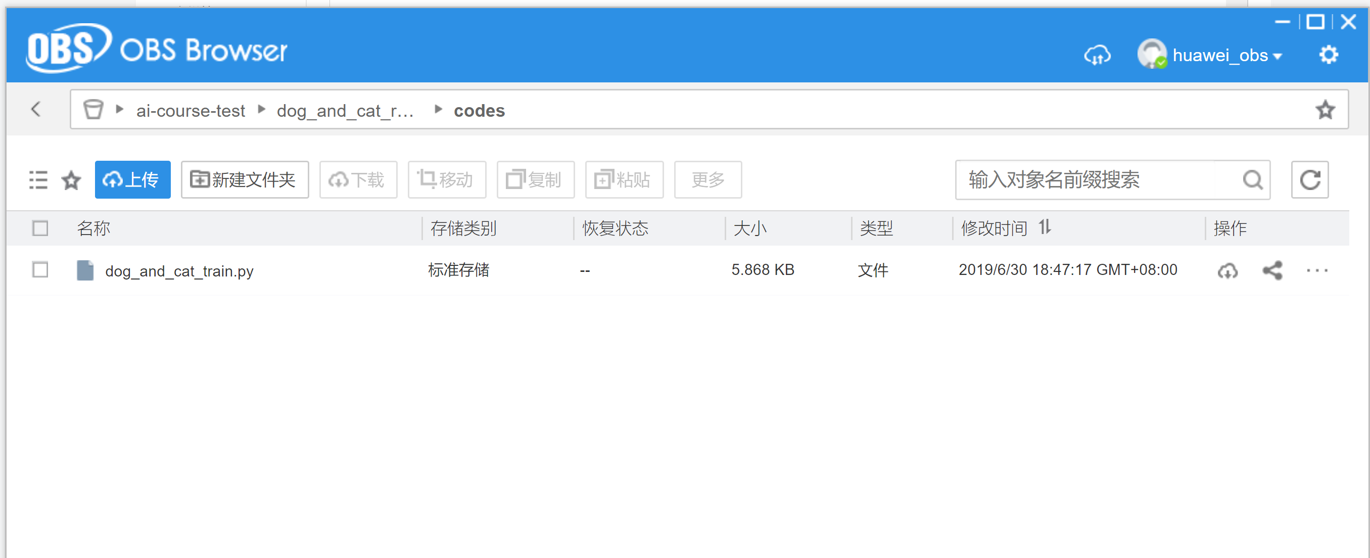 步骤 1 在本地的ModelArts-Lab代码库train_inference/image_recognition/codes/路径下找到模型训练脚本dog_and_cat_train.py ,将训练脚本上传至OBS路径/ai-course-001/dog_and_cat_recognition/codes/下(codes文件夹如果不存在,需创建,该文件夹名称可以自定义)。