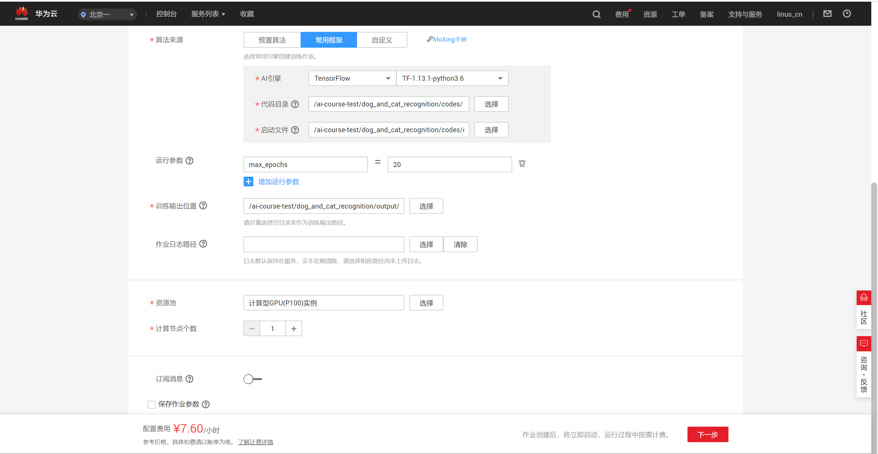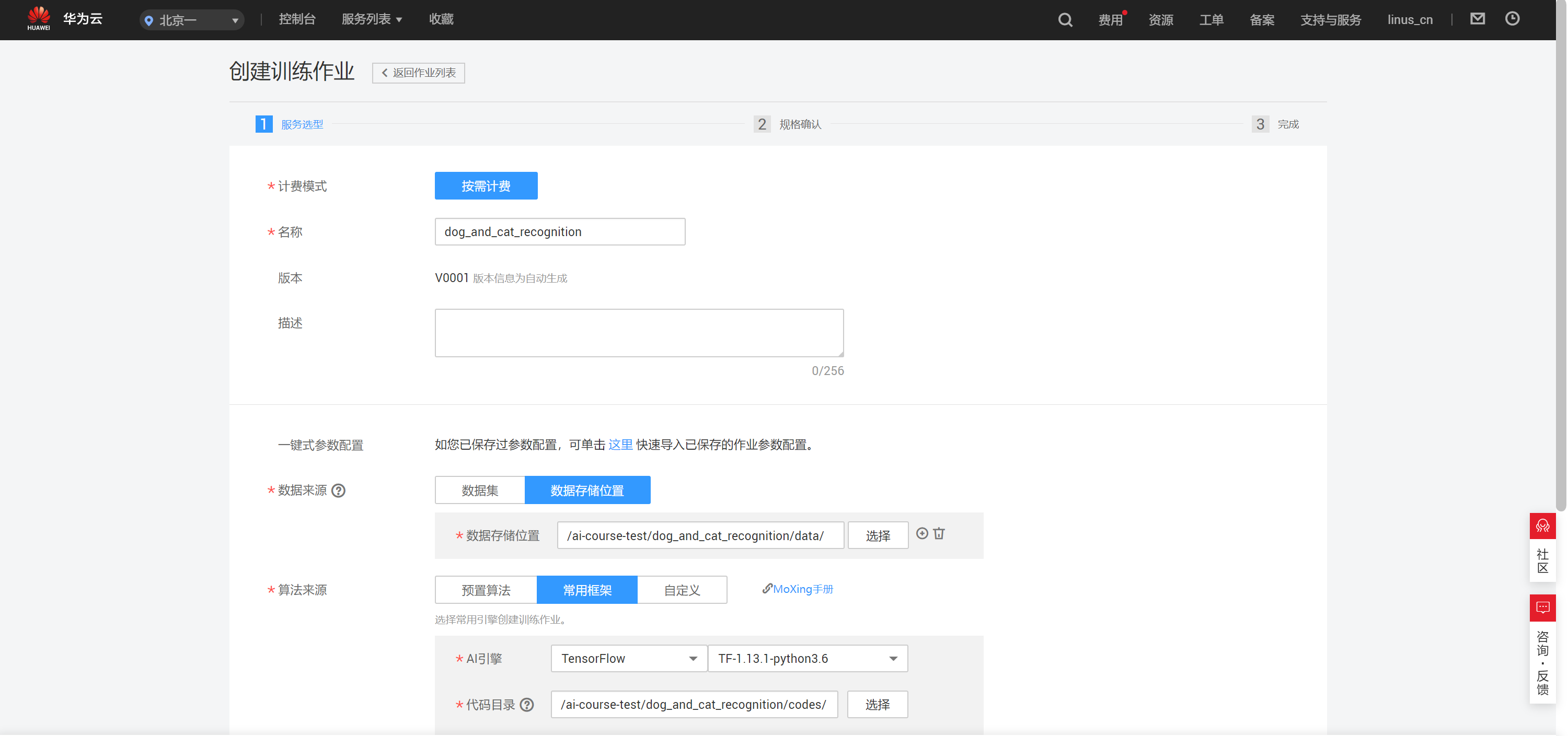 代码目录:训练脚本所在的目录,选择OBS路径/ai-course-test/dog_and_cat_recognition/codes/