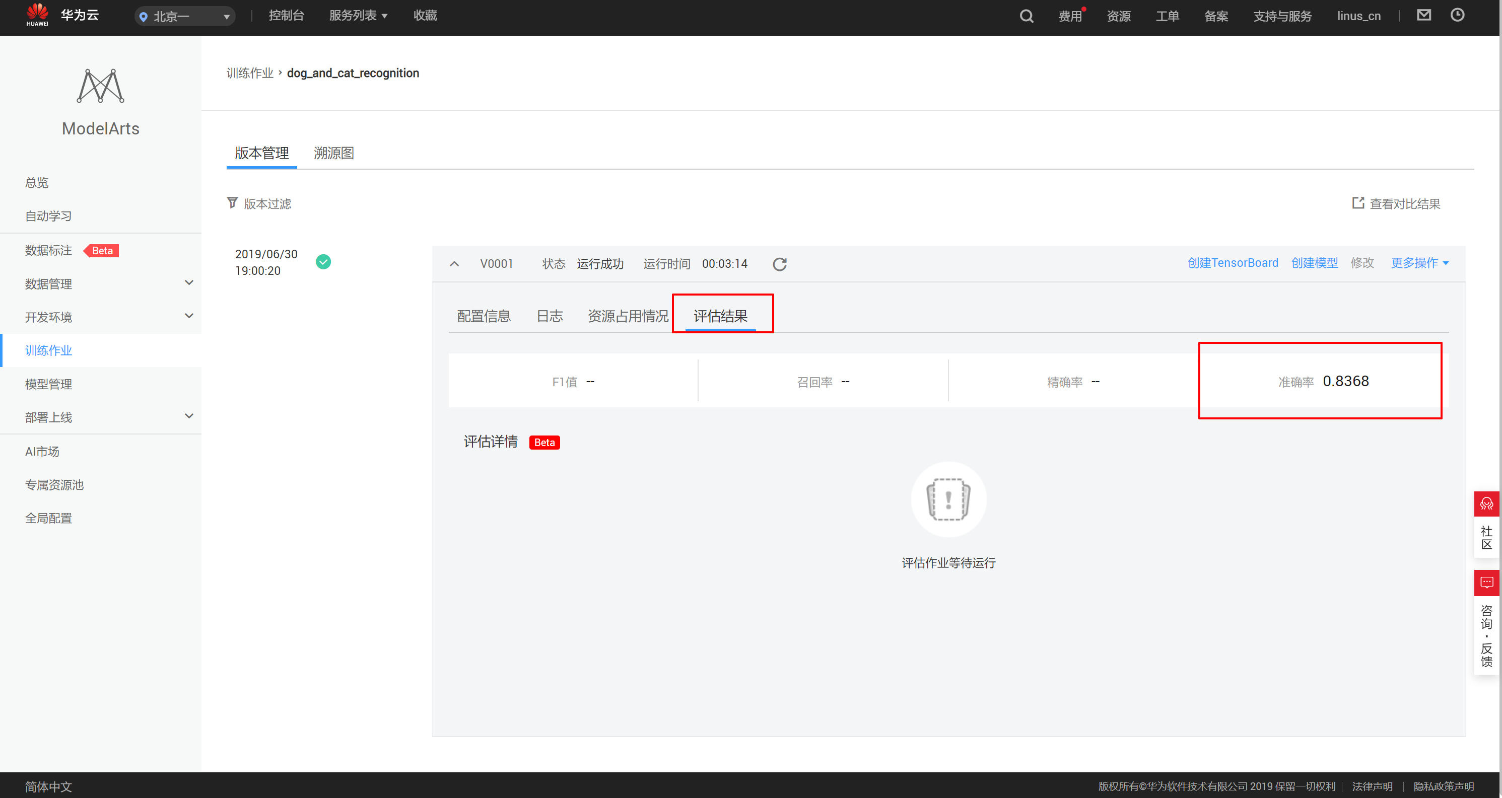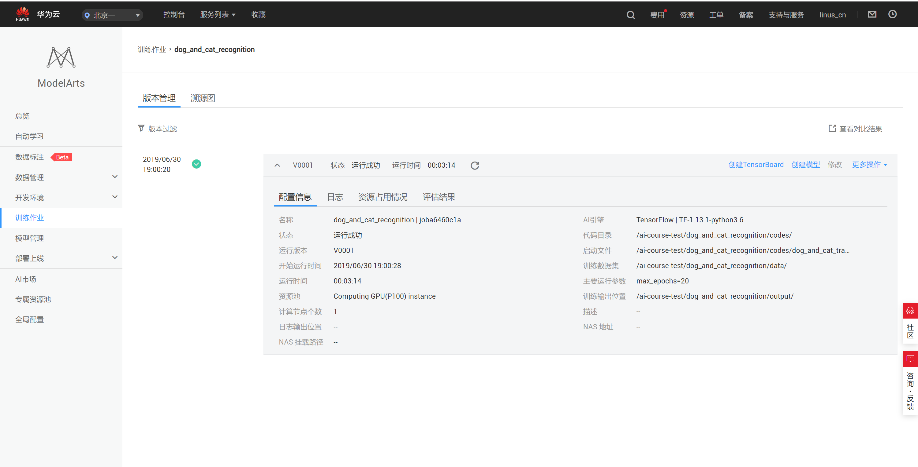 选择训练作业:选择之前创建的猫狗识别训练作业