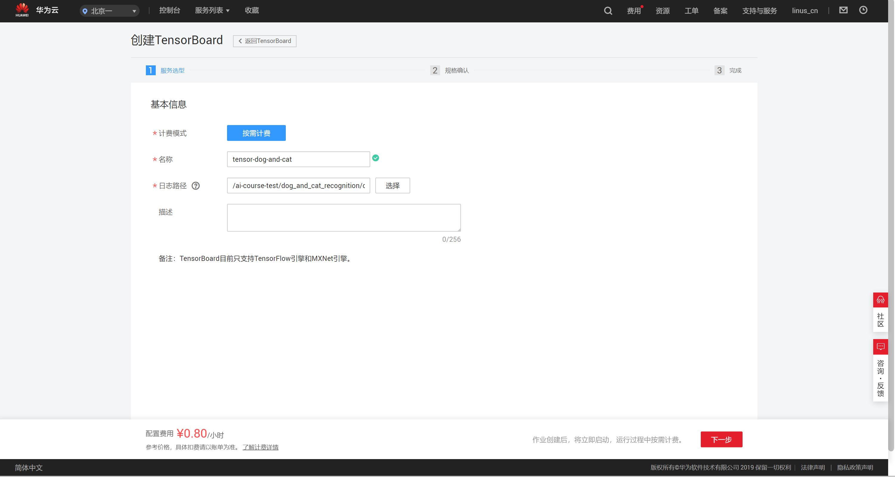点击“下一步”,确认参数,然后点击“立即创建”。最后点击“返回TensorBoard”,等待TensorBoard创建完成。