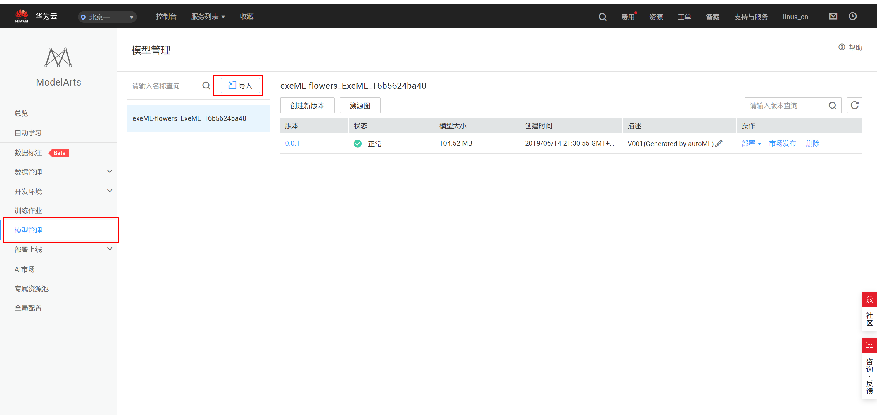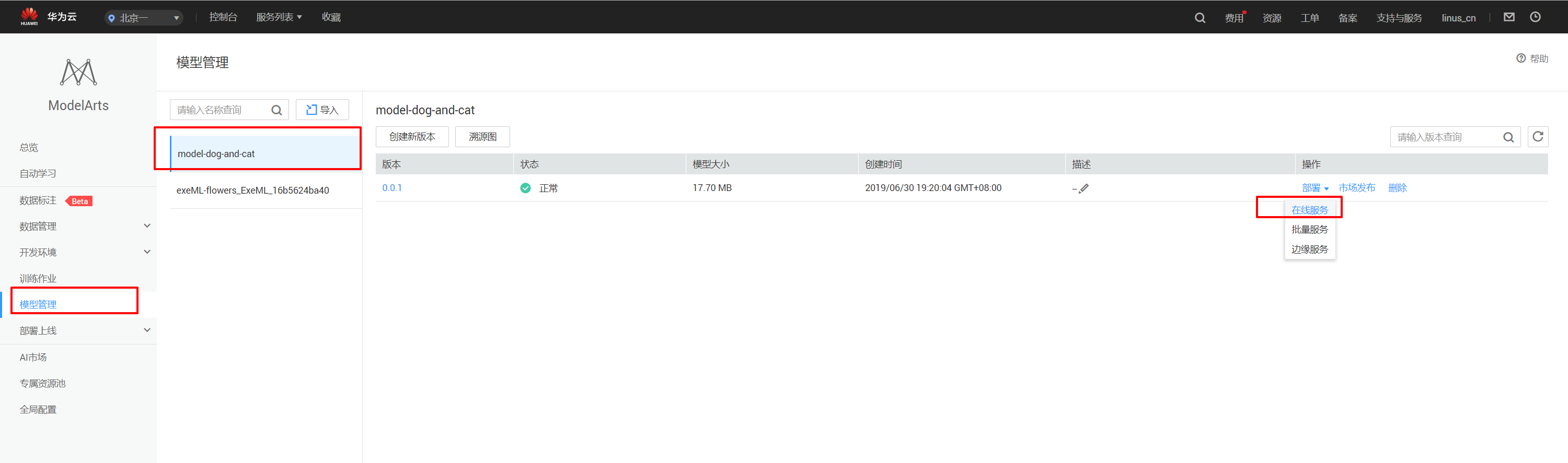 在模型管理页面, 找到之前导入的模型,点击“部署”下拉框中的“在线服务”,如下图: