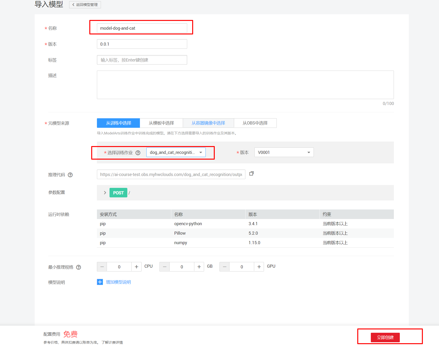 所有字段填写好之后,确认参数无误,点击下一步,然后点击立即创建,开始训练。训练时长预计5到8分钟左右,ModelArts使用高峰期可能会有时间延迟。