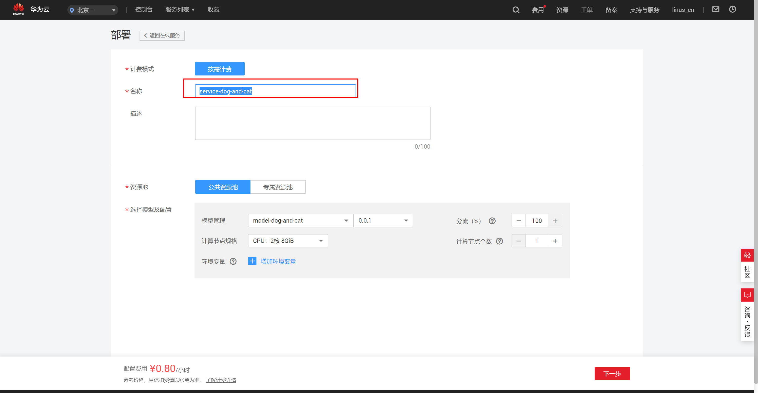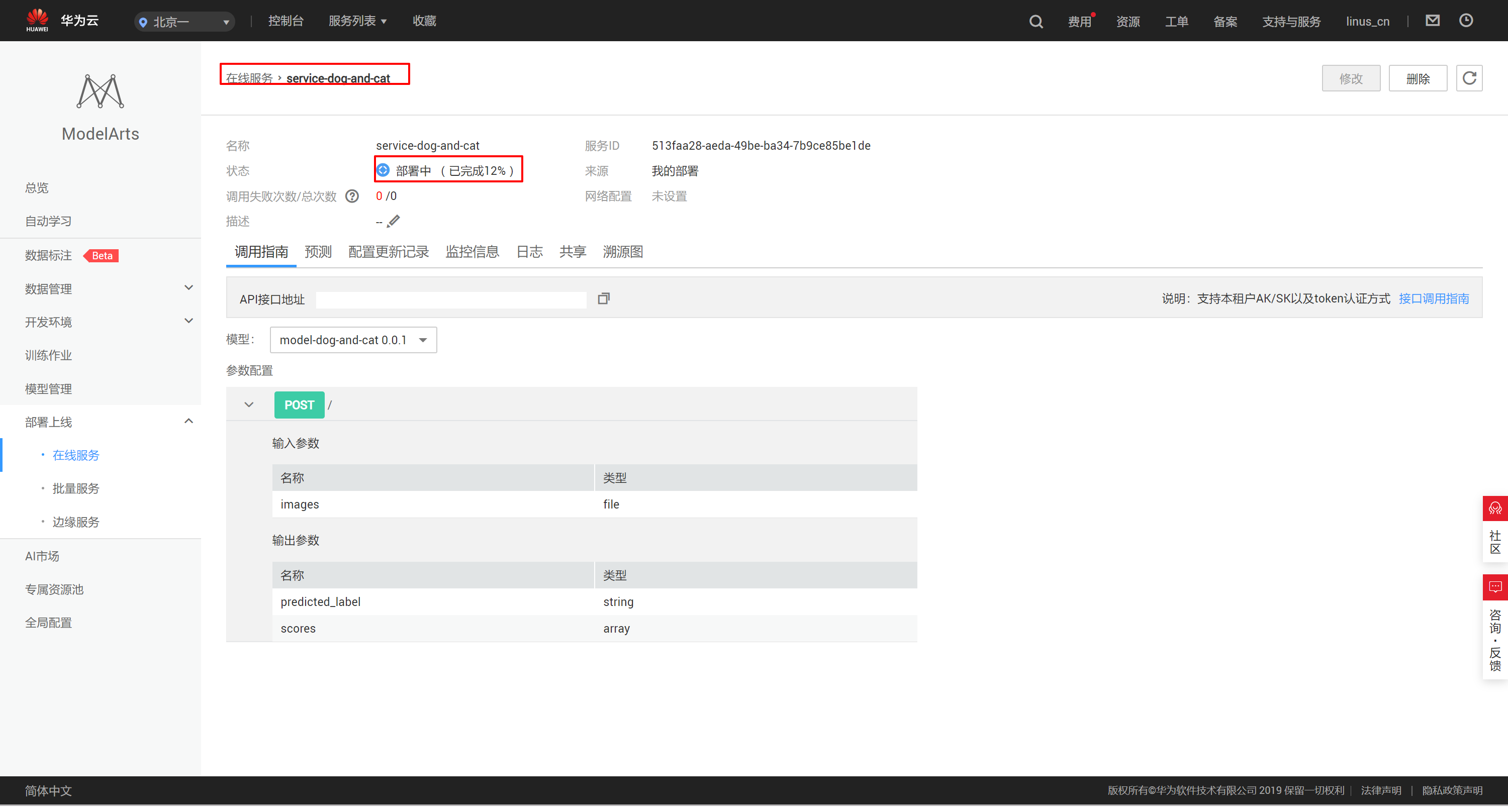 点击“下一步”按钮,然后点击“立即创建”按钮,最后点击“查看服务详情”。等待在线服务部署成功(状态变成“运行中”),大概需要预计3到8分钟左右,ModelArts使用高峰期可能会有时间延迟。