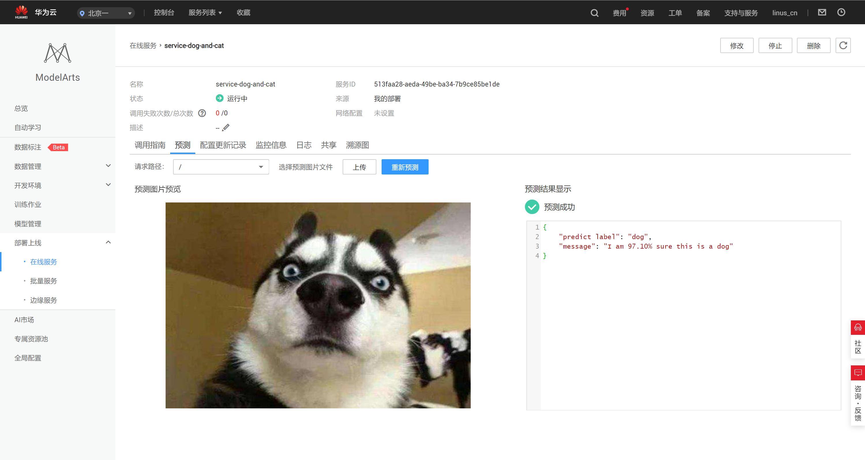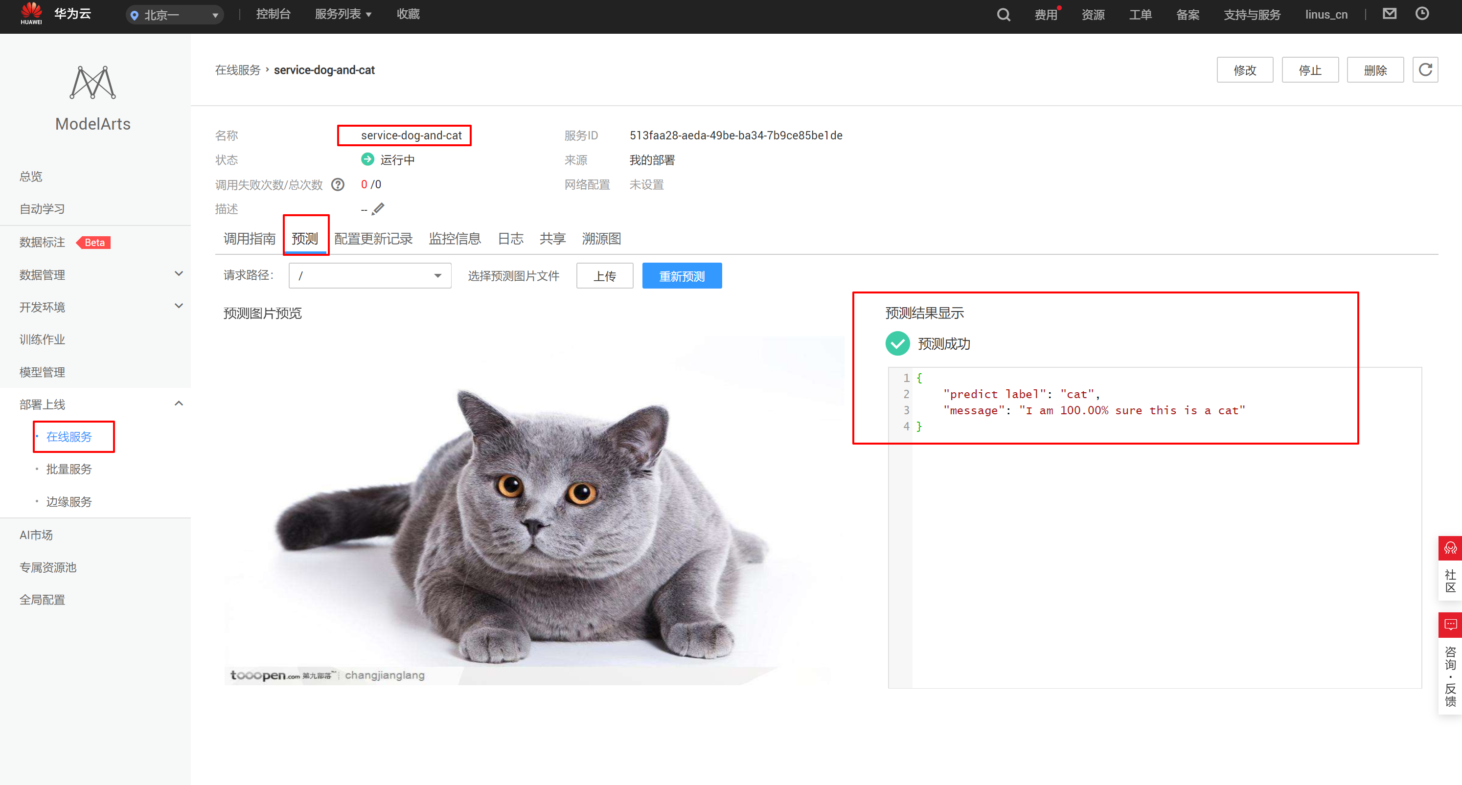当在线服务部署成功后,我们可以使用测试图片进行预测。
