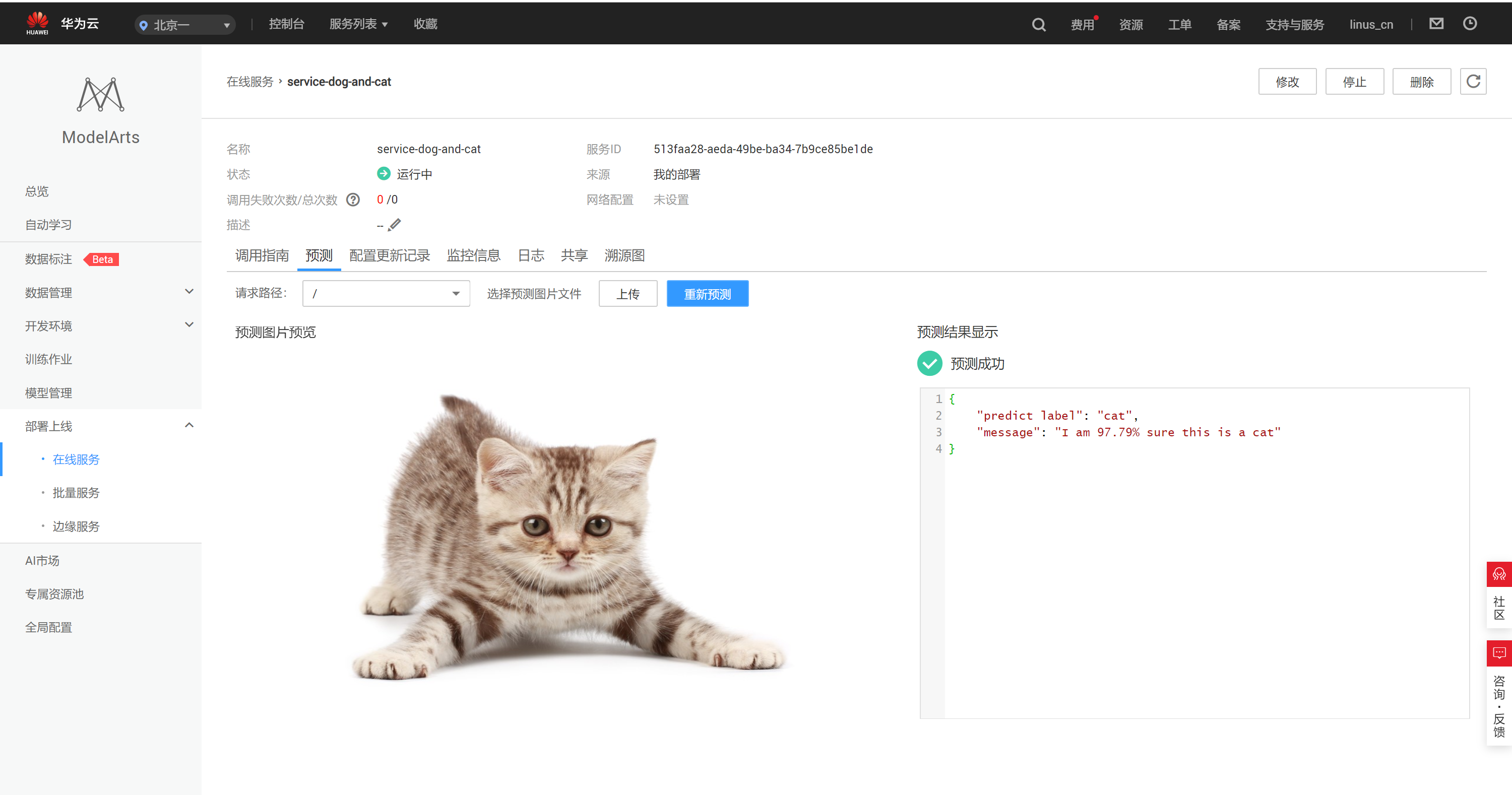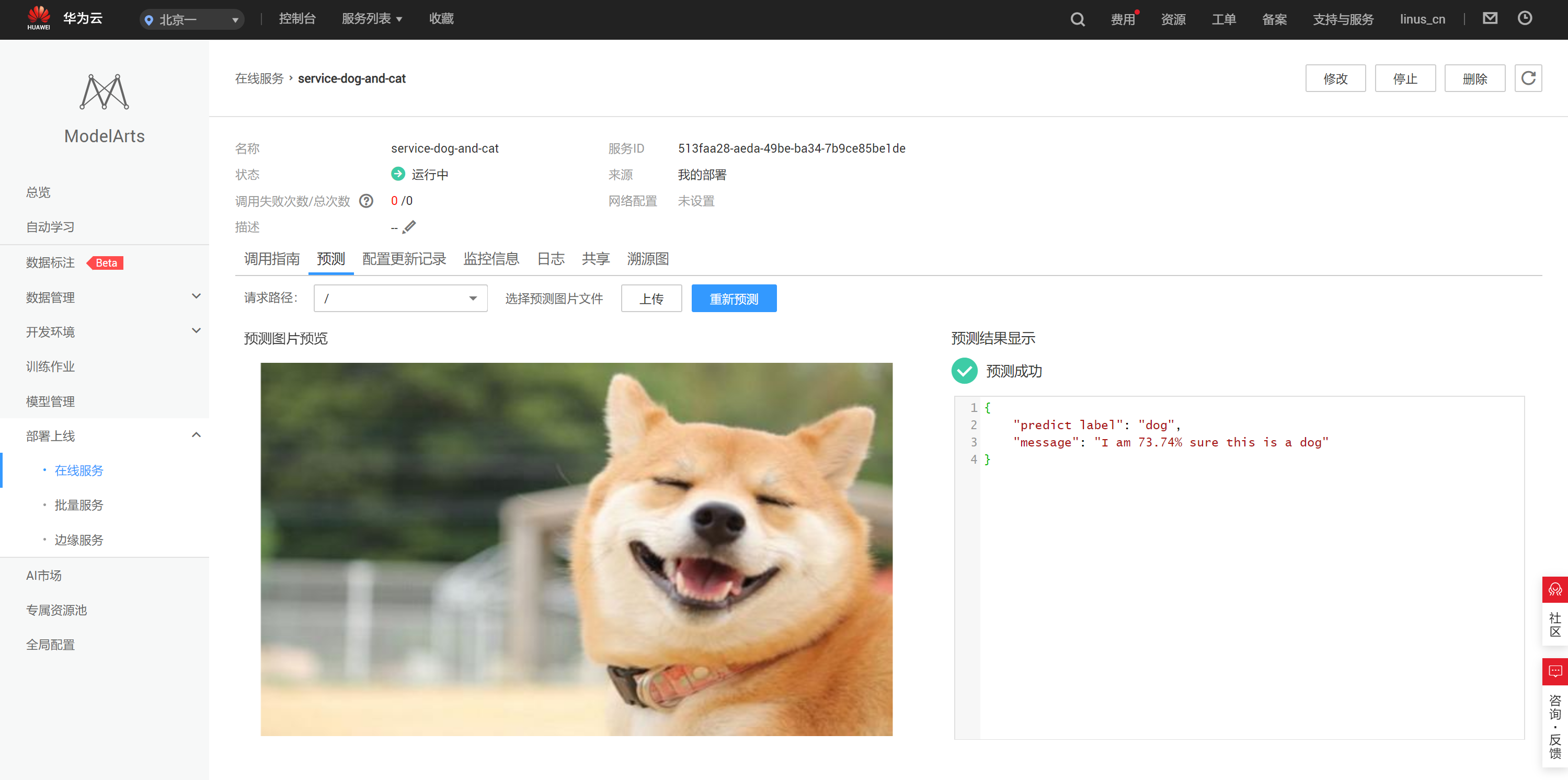 在“部署上线”->"在线服务"中,找到自己刚刚部署的在线服务,点击进入,然后点击“预测”页签。点击“上传”按钮,选择准备好的猫或者狗图片,并上传,然后点击“预测”按钮,预测结果会出现在右侧输出框中,如下图所示: