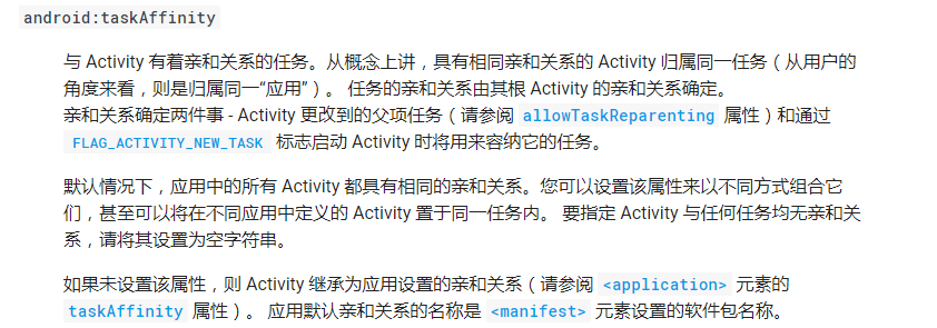 那么我们如何指定启动的Activity所需的栈名称,这里就要说TaskAffinity参数,这里我们参考官方文档: