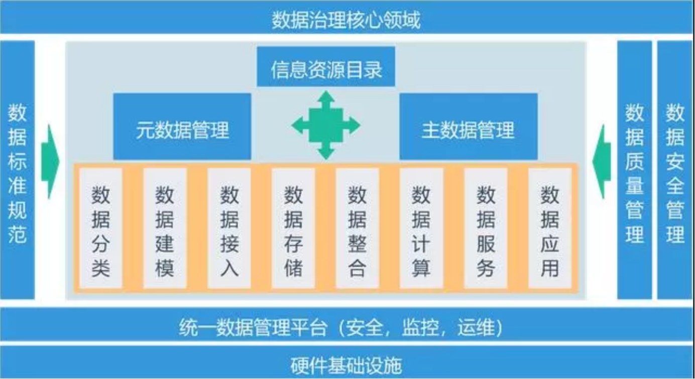 每个数据治理的领域都可作为一个独立方向进行研究治理,目前总结的数据治理领域包括但不限于一下内容:数据标准、元数据、数据模型、数据分布、数据存储、数据交换、数据生命周期管理、数据质量、数据安全以及数据共享服务。