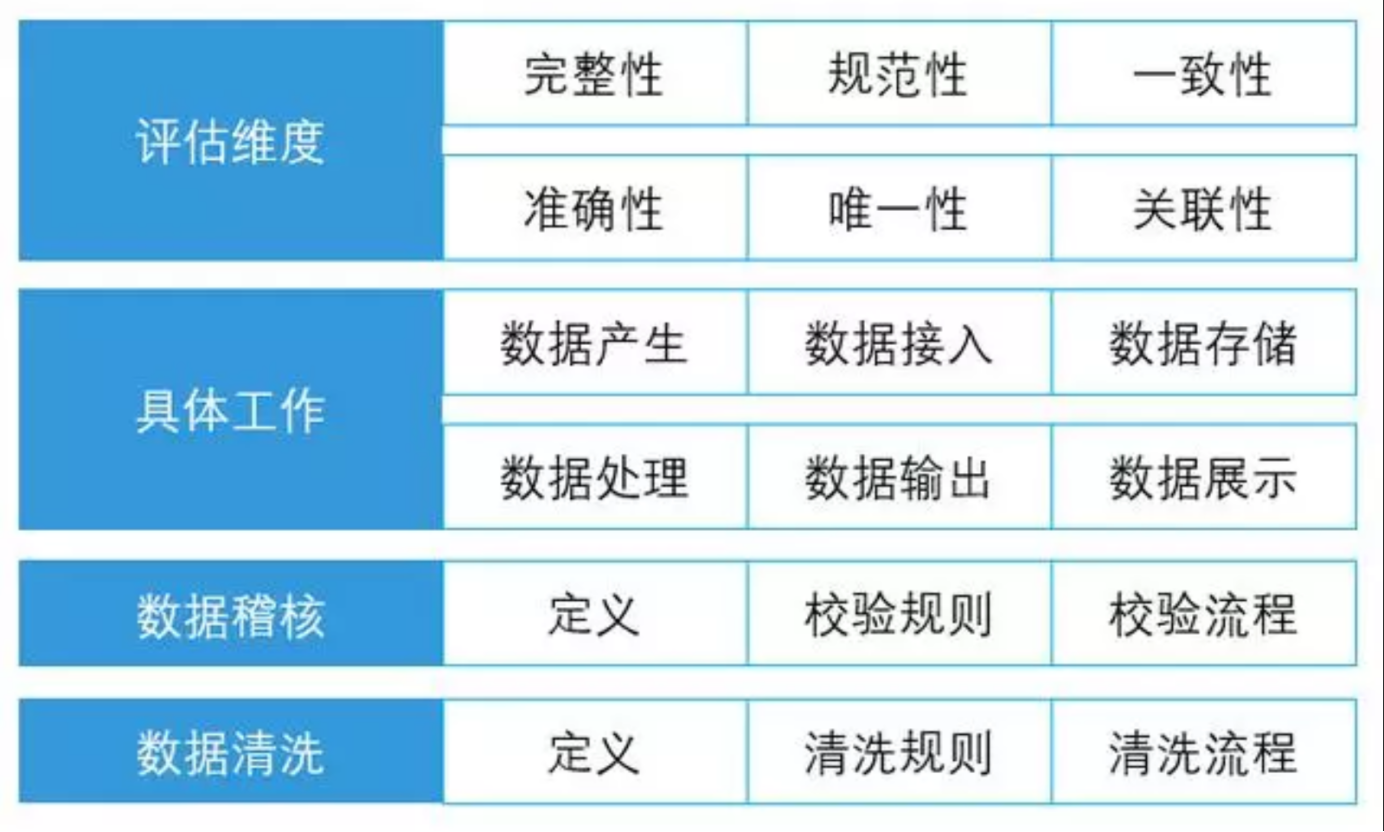 制度和规范。从技术层面上,应该完整全面的定义数据质量的评估维度,包括完整性、时效性等,按照已定义的维度,在系统建设的各个阶段都应该根据标准进行数据质量检测和规范,及时进行治理,避免事后的清洗工作。