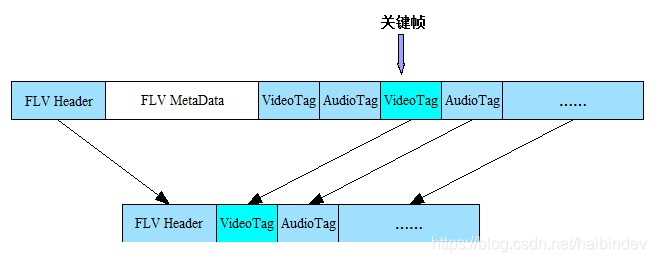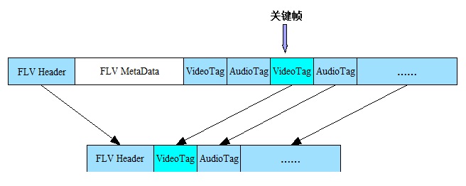 对于FLV来说,因为其格式简单,头部非常小,而MetaData可以不要,所以只需要寻找到关键帧,然后拼上FLV Header,就可以组成一个可播放的视频文件。如下图所示: