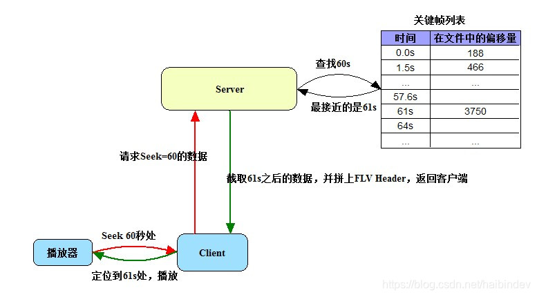 首先,解析flv文件,生成flv视频关键帧列表,表明时间和便宜量的对应关系。然后,当接收到客户端发来的数据请求时,根据客户端拖动的时间点的请求,找出时间距离最近的关键帧,根据偏移量,读取flv的文件数据,然后拼接flv的9字节文件头部(还需要再加上4个字节全零的pre tag size,共13字节),返回。