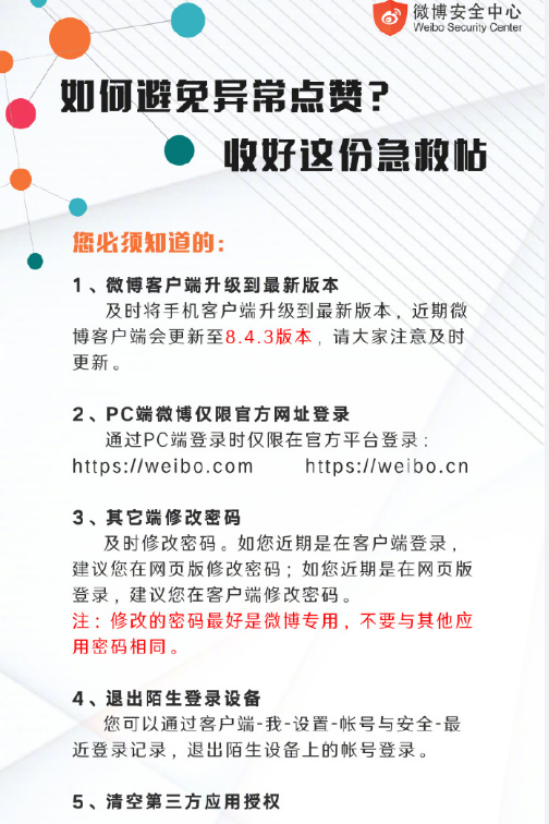 对此,微博安全中心也曾给过一些安全建议,比如:建议用户更换密码、升级客户端、设置登录保护、清除第三方应用权限等等,但是不少用户按照建议完成这些操作后,被盗赞的问题仍然存在。