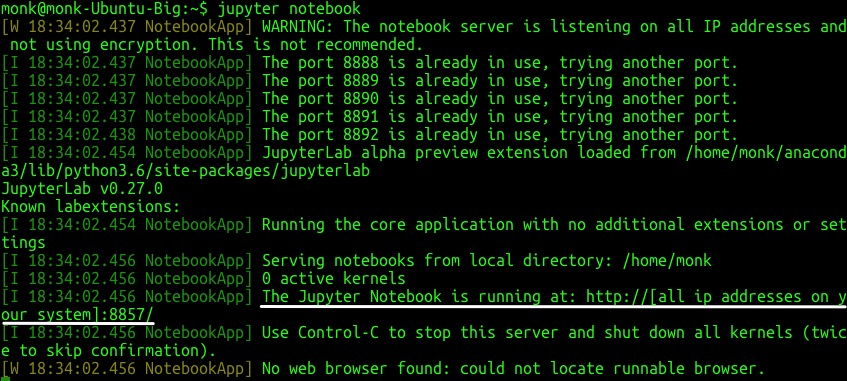 运行命令后,提示jupyter notebook已经启动了,而且端口号是8857,前面提示有很多端口已经在使用了,这是因为别的程序在使用这些端口,不影响远程使用jupyter。