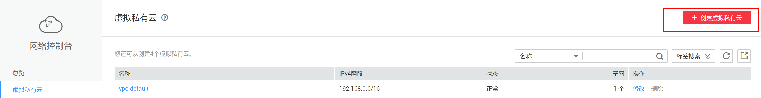 进入网络控制台-虚拟私有云页面,点击页面右上角部分的【+创建虚拟私有云】,进入创建页面