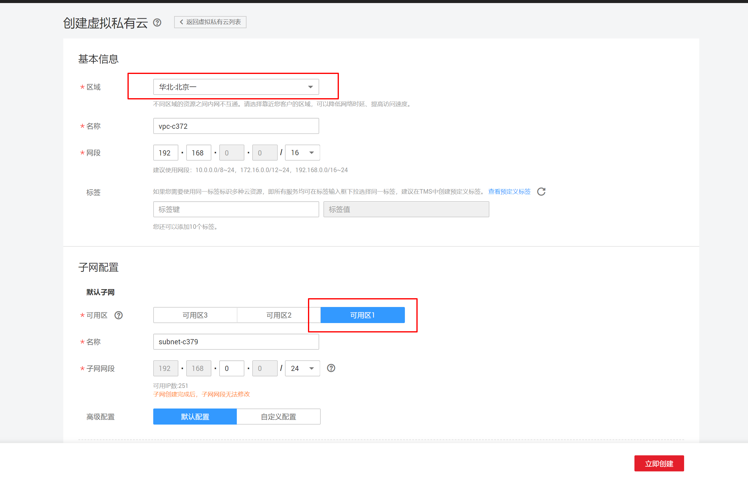 在虚拟私有云的创建页面,确定两个部分无误,其他的选择默认,如下图: