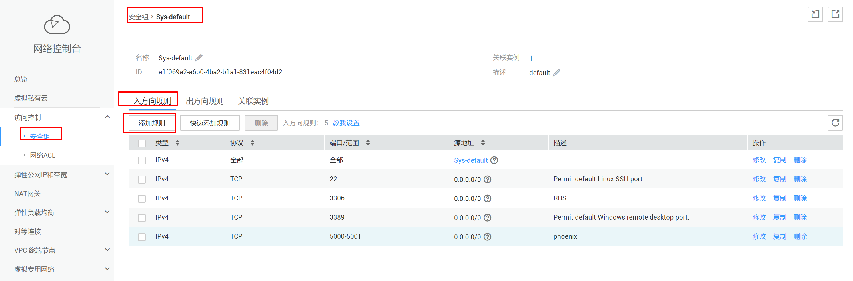 在【网络控制台】-【虚拟私有云】下方的【访问控制】中选择子菜单【安全组】,进行安全组设置,并添加安全组规则,如下图:
