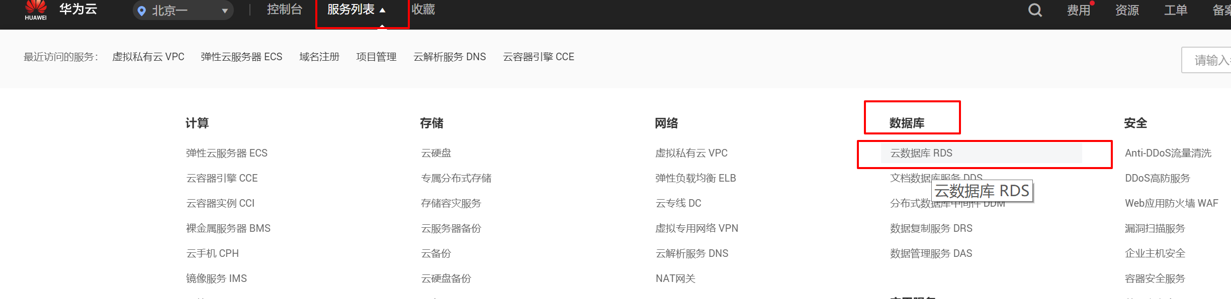 同样是页面上方的【服务列表】,点击后,在显示出的服务中,找【数据库】,选择云数据库RDS,如下图所示