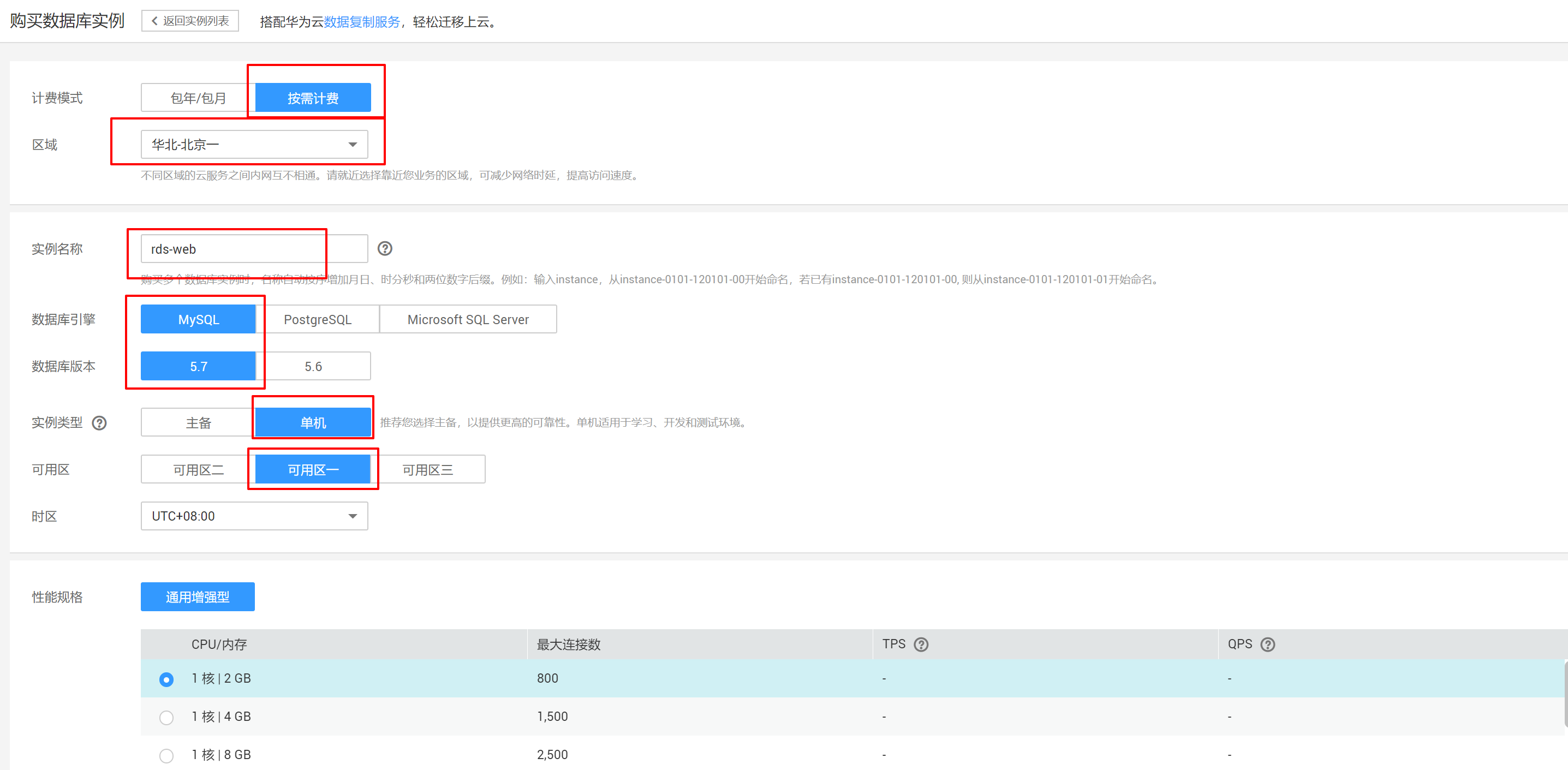 此处采用按需计费,因为是学习实践,区域选择华北-北京一,与虚拟私有云VPC保持一致,切记,实例名称修改为rds-web,便于识别,MySQL 5.7,单机、可用区一,其他部分采用默认,可不用调整