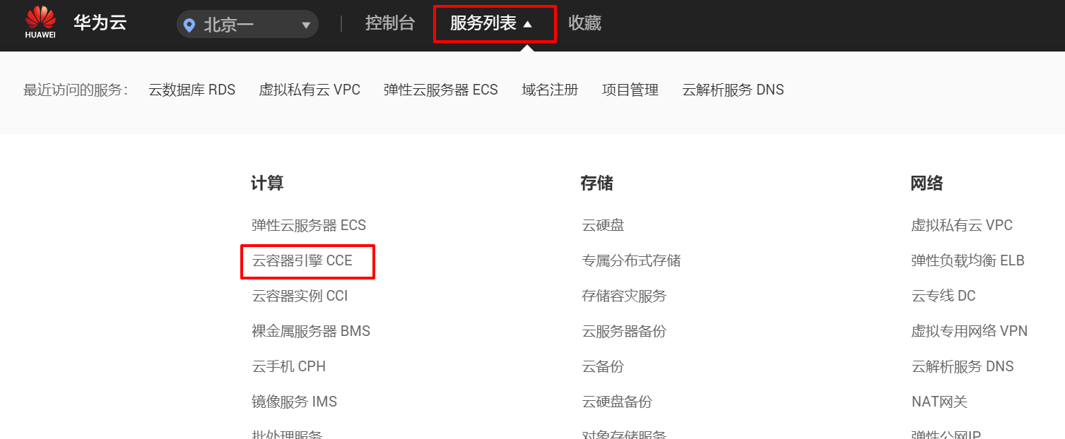 同样的操作手法,在页面上方点击【服务列表】,展示的服务中选择【计算】下的【云容器引擎 CCE】