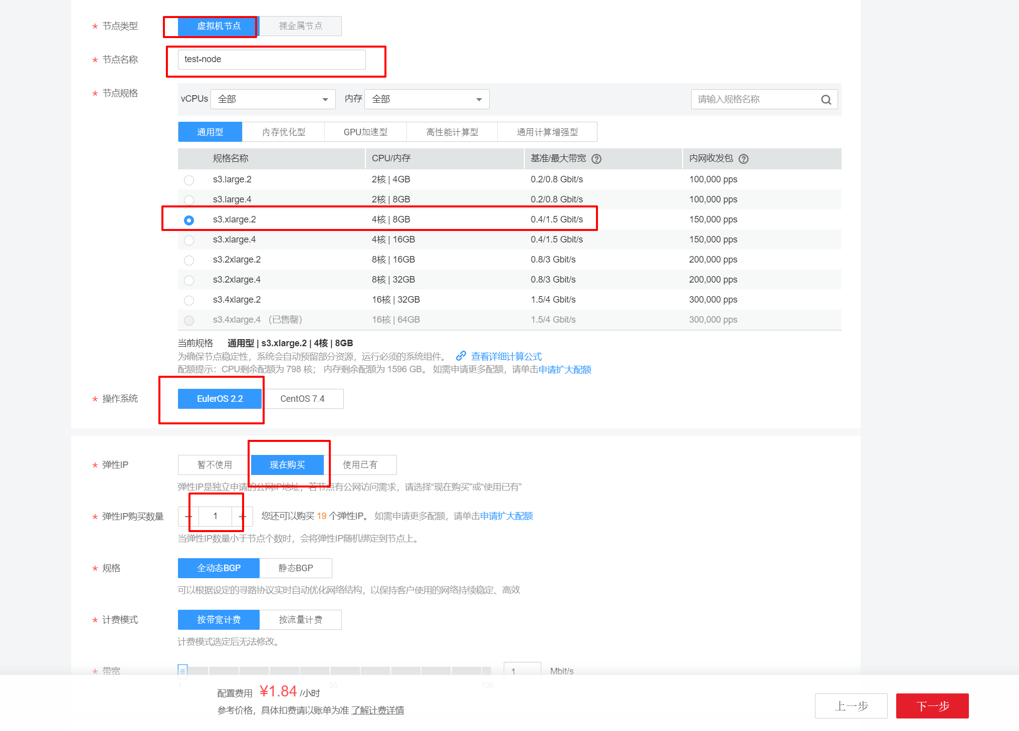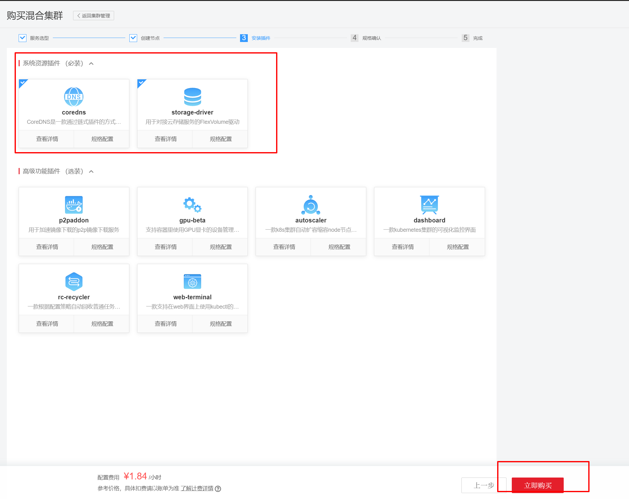 现在添加,按需计费,华北-北京一,可用区1,虚拟机节点,节点名称为test-node,选择4核8G,弹性IP:现在购买,数量1,带宽1M,其他使用默认配置,确认无误后,点击【下一步】,进入安装插件页面,系统资源插件必选2项,选装部分不动,即此页使用默认,点击【立即购买】