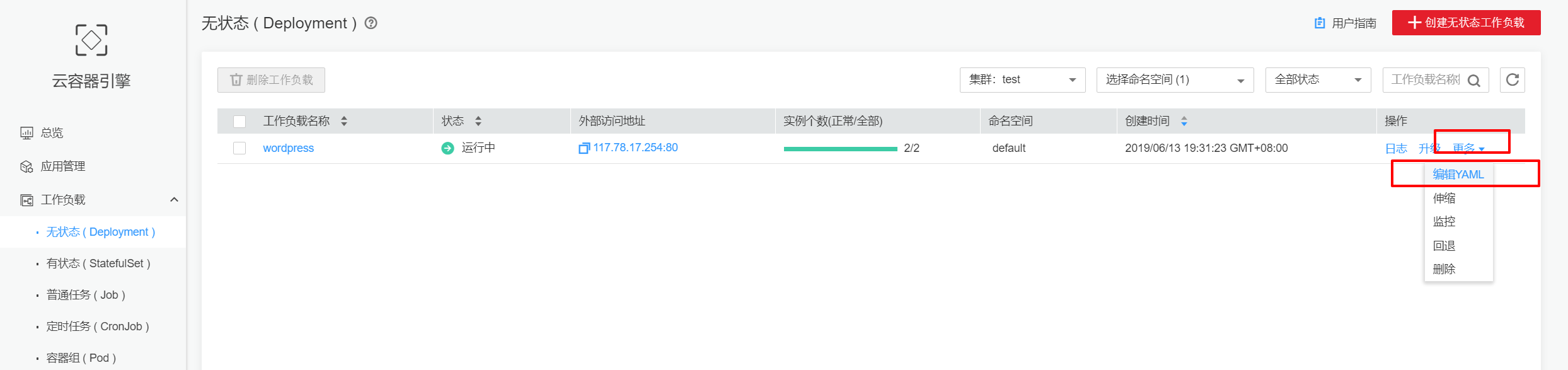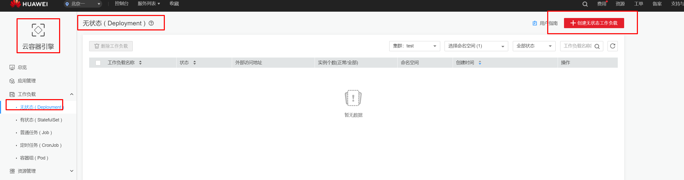此步必须等集群创建完成,待完成后,在原资源列表页面中,点击【工作负载】,点击【+创建无状态工作负载】,如下图所示: