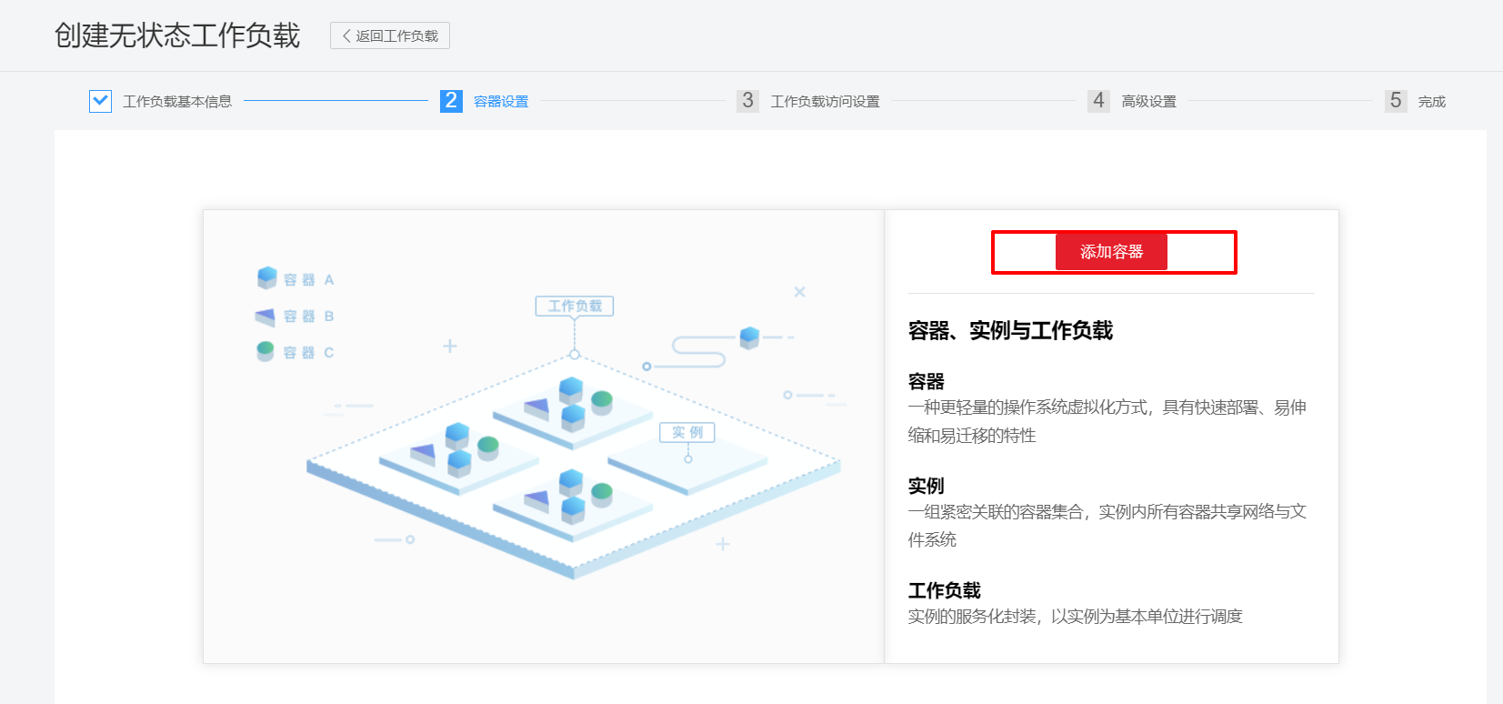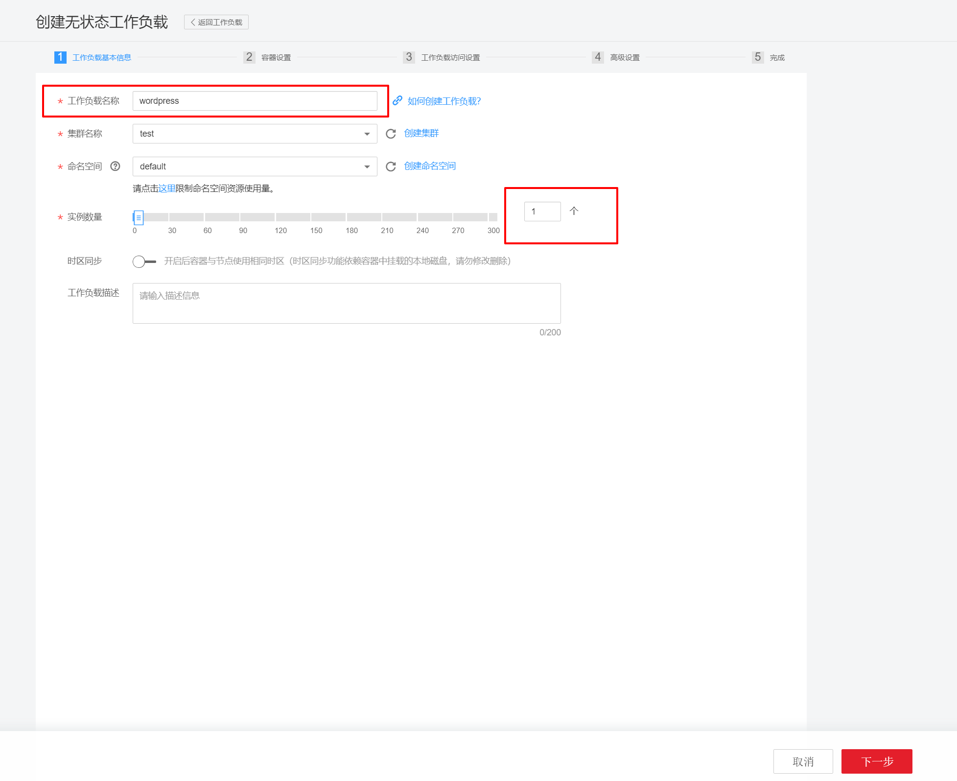 进入创建无状态负载页面,调整两个配置:工作负载名称和实例数量,点击【下一步】
