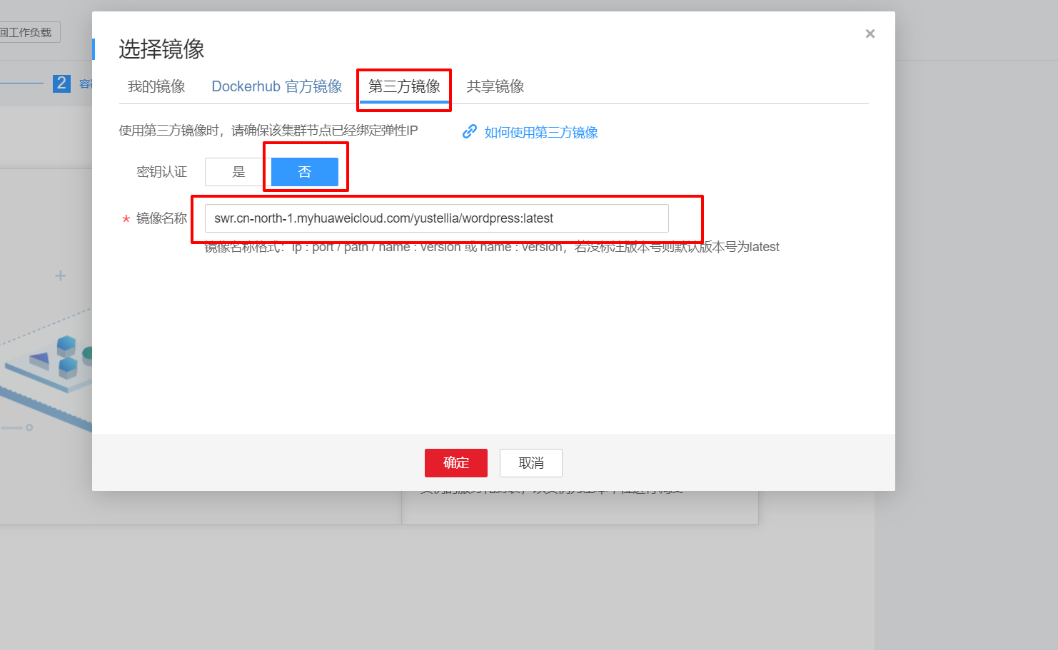 在添加容器页面,点击【添加容器】按钮,弹出【选择镜像】页面,选择“第三方镜像”,密钥认证为“否”,镜像名称请输入: