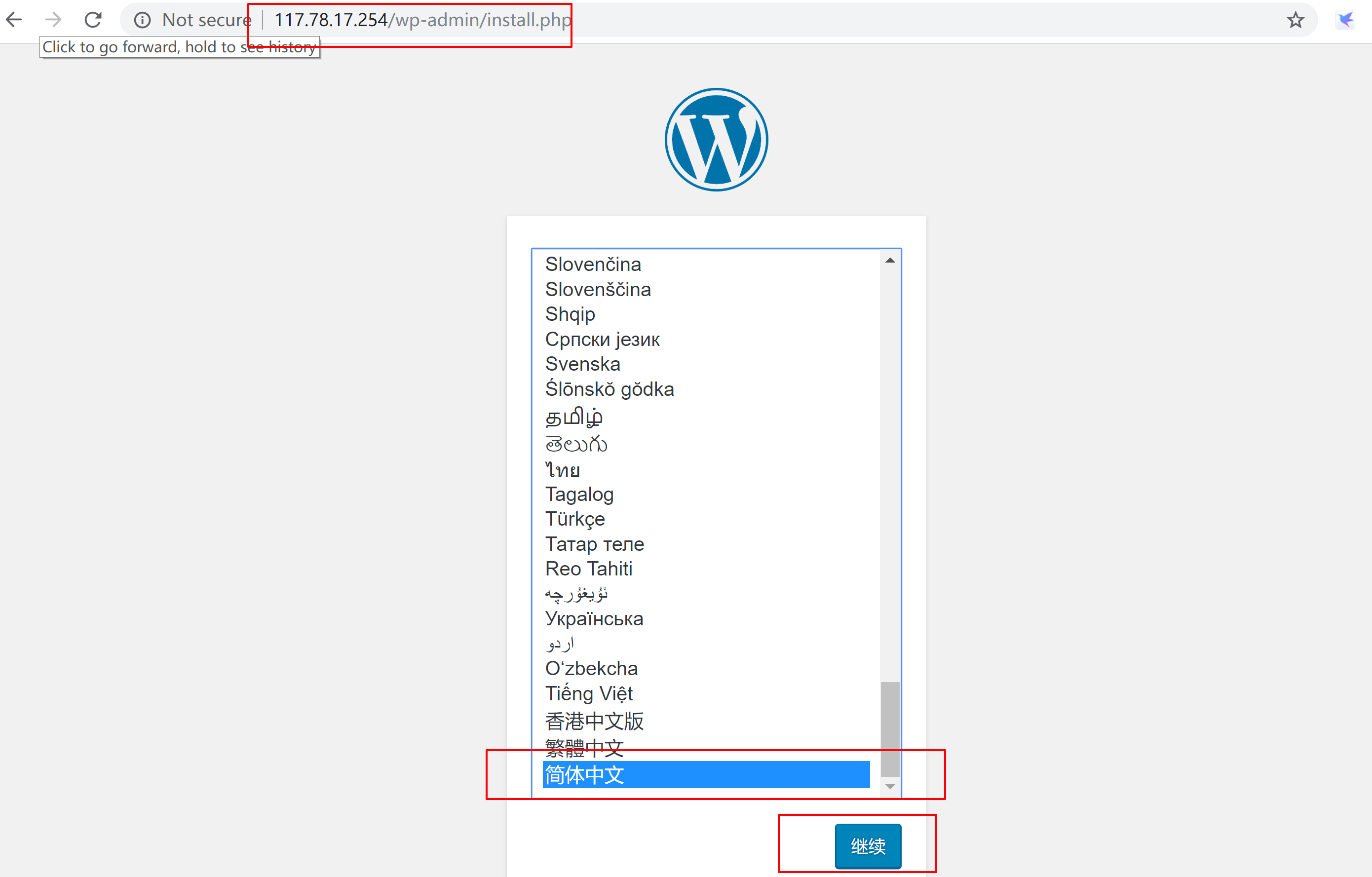 上图中的http://117.78.17.254/wp-admin/install.php 为 117.78.17.254:80 自动映射的地址,选择简体中文,点击【继续】