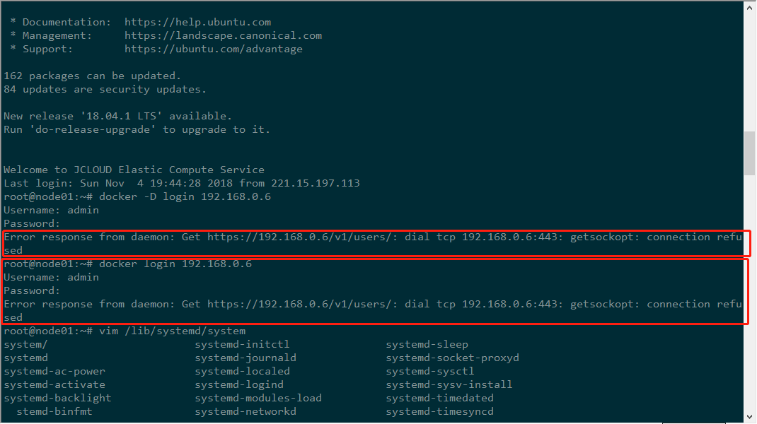 Error response from daemon: Get https://192.168.0.6/v1/users/: dial tcp 192.168.0.6:443: getsockopt: connection refused