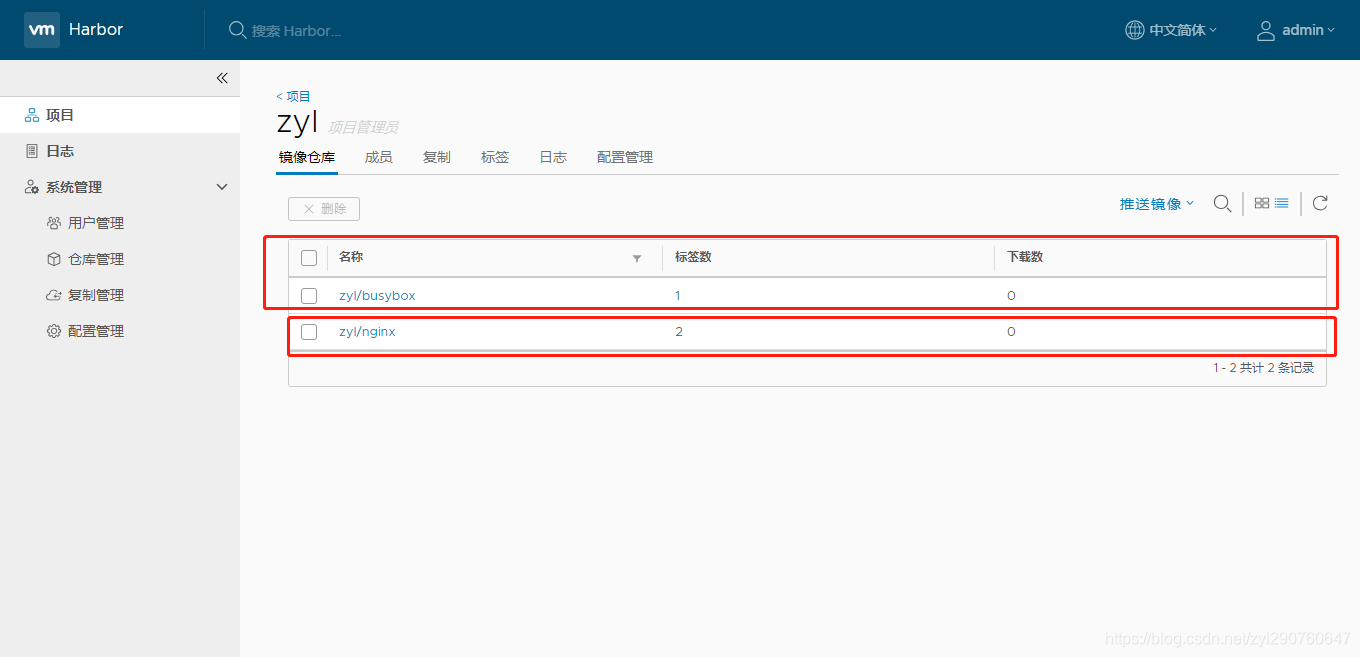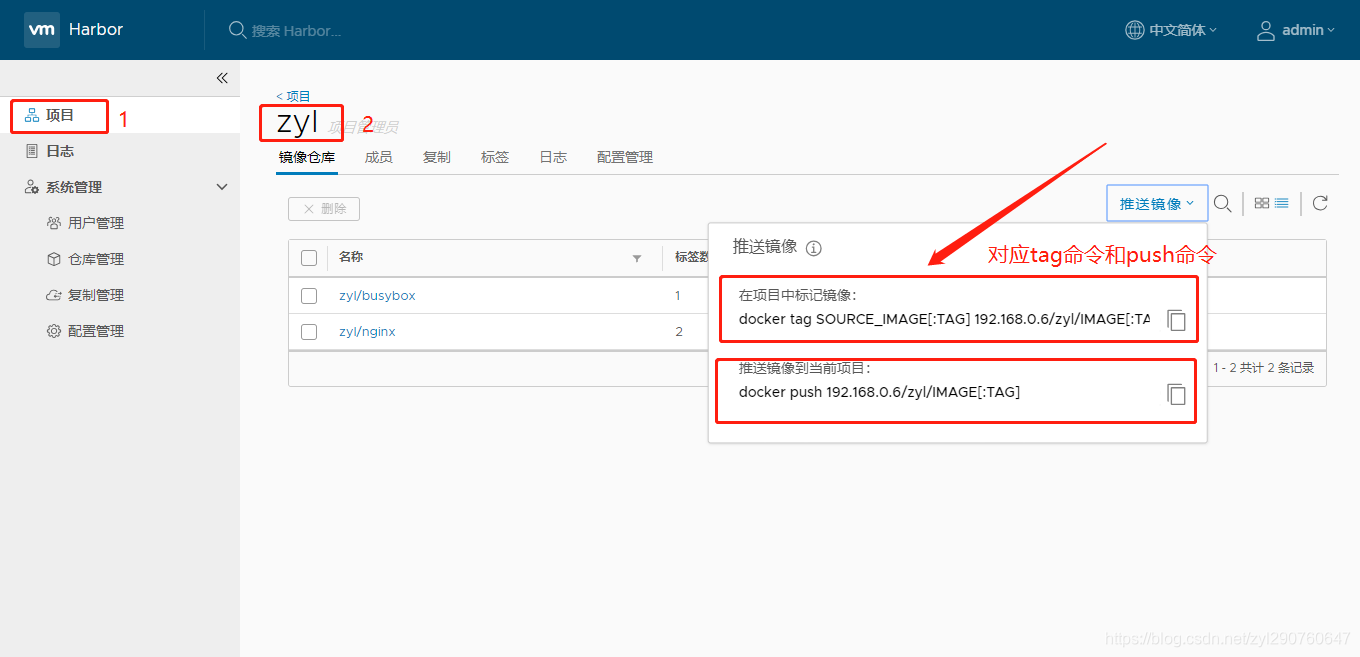 在harbor界面操作如下,项目---zyl(项目名称)---镜像仓库,点击推送镜像 可以看到相关的tag命令和push命令。