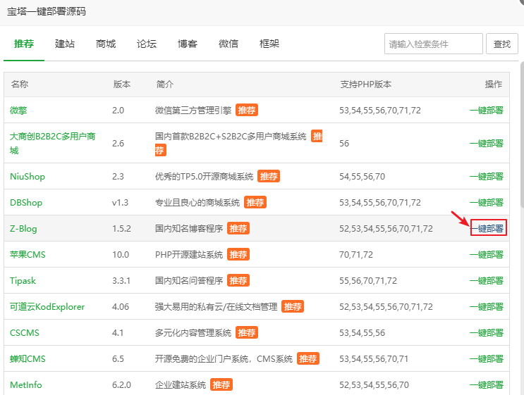 安装面板结束后,我们手动去软件商店去安装一下“宝塔一键部署源码”
