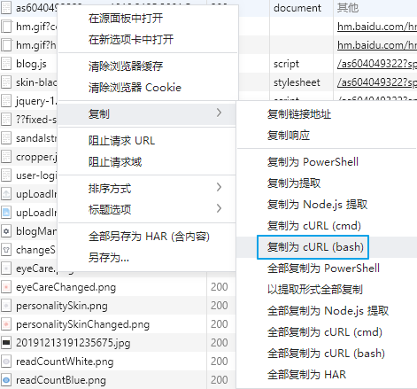 先在谷歌游览器中复制网络抓到的网络请求为cURL(bash):
