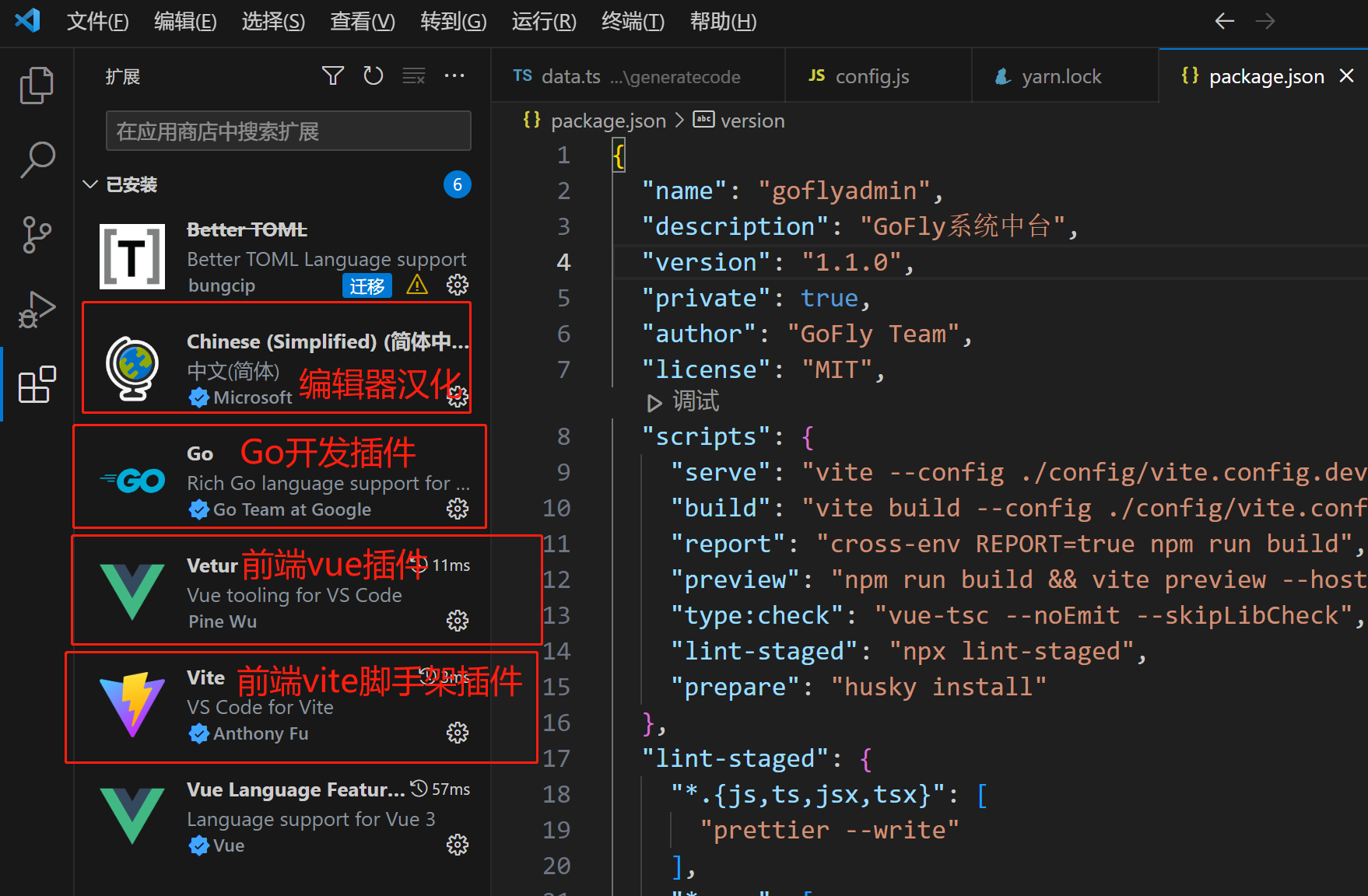 VSCode 开发go项目需要安装的插件 Go、Vetur、Vite登。