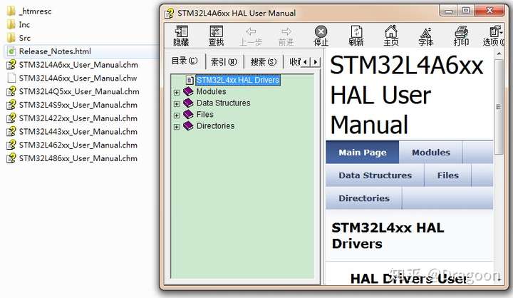 STM32L4xx_HAL_Driver:包含了所有的 STM32l4xx 系列 HAL 库头文件和源文件,也就是所有底层硬件抽象层 API 声明和定义。该文件 夹包含 Src 和 Inc 两个子文件夹,其中 Src 子文件夹 存放的是.c 源文件,Inc 子文件夹存放的是与之对应 的.h 头文件。每个.c 源文件对应一个.h 头文件。源文件名称基本遵循 stm32l4xx_hal_ppp.c 定义格式, 头文件名称基本遵循 stm32l4xx_hal_ppp.h 定义格 式。比如 gpio 相关的 API 的声明和定义在文件 stm32l4xx_hal_gpio.h 和 stm32l4xx_hal_gpio.c 中。 该文件夹中一般会存放用户参考手册,各种函数API都可以在.chm文件中查找。