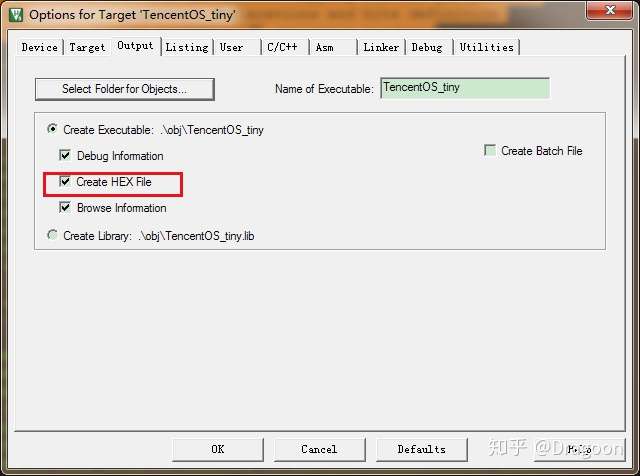 4、勾选创造HEX文件,HEX文件才是我们下到芯片中的文件