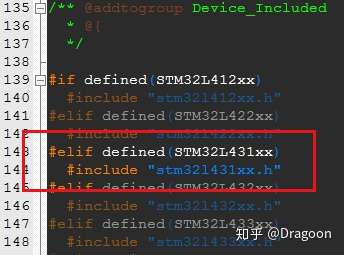 它是所有 stm32l4 系列的顶层头文件。 使用 STM32l4 任何型号的芯片,都需要包含这个头文件。同时,因为 stm32l4 系列芯片型 号非常多,ST 为每种芯片型号定义了一个特有的片上外设访问层头文件,比如 STM32L431 系列,ST 定义了一个头文件 stm32l431xx.h,然后 stm32l4xx.h 顶层头文件会根据工程芯片型号,来选择包含对应芯片的片上外设访问层头文件。