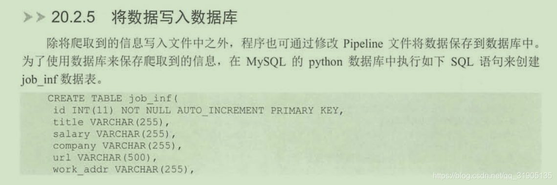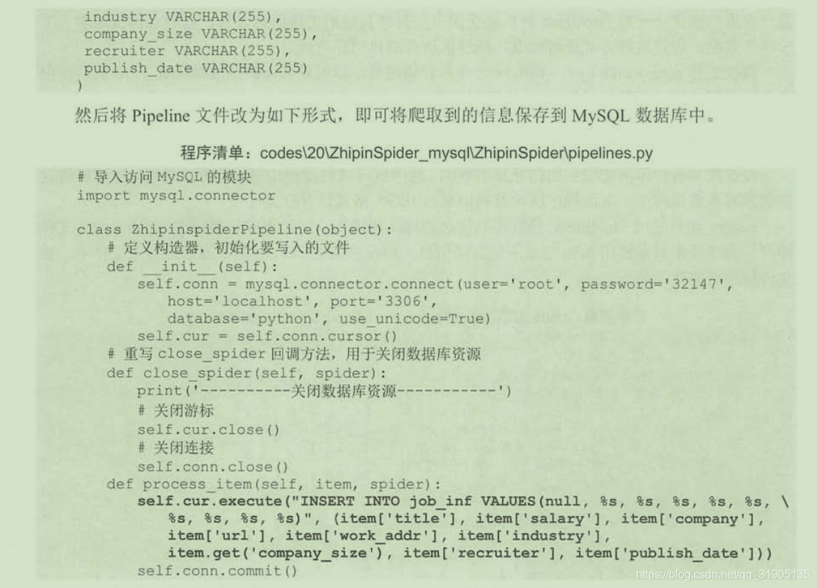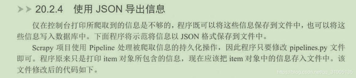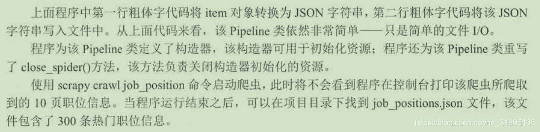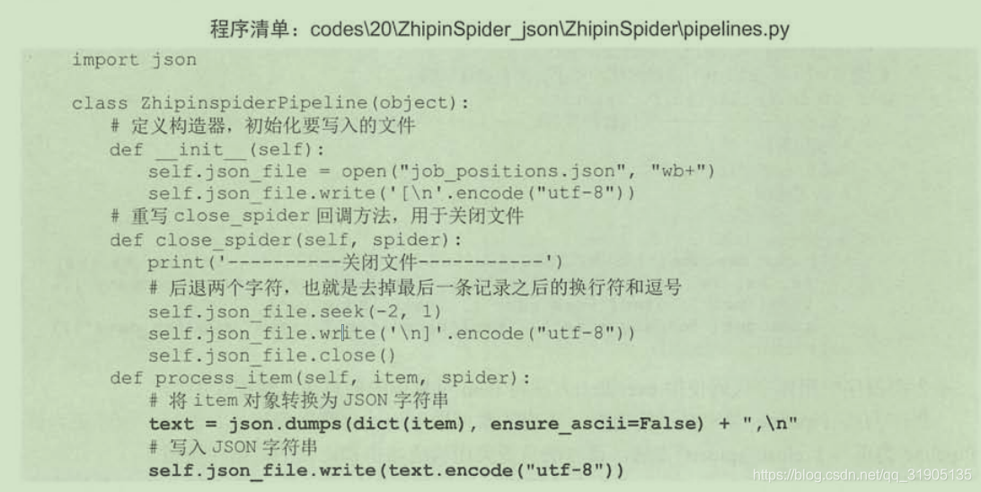 (3)编写piplines.py文件,该文件负责将所爬取的数据写入文件或者数据库中