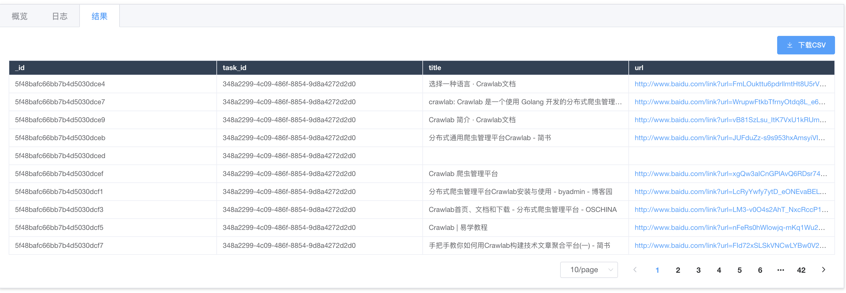 并且,我们还可以在 “结果” 中查看抓取到的结果数据。这些结果是默认保存在 MongoDB 数据库里的。