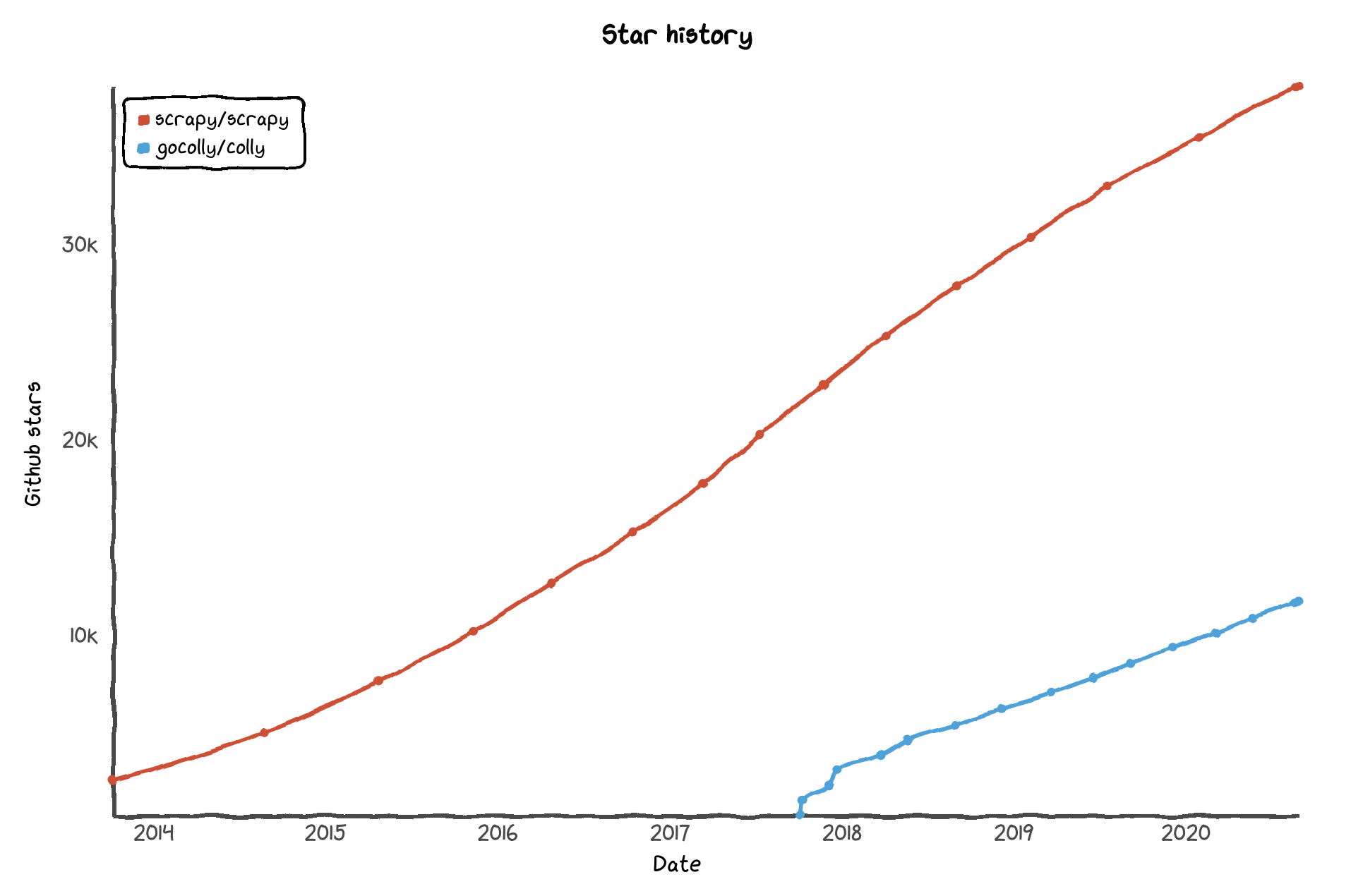 下图是 Colly 和 Scrapy 在 Github 的 Star 数对比。可以看到 Colly 发展较晚,star 数不到 Scrapy 的三分之一,但还在高速增长当中。本文将着重介绍这个年轻而强大的爬虫框架: Colly。