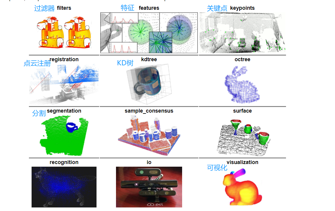 PCL库主要包括:点云获取、滤波、分割、配准、检索、特征提取、识别、追踪、曲面重建、可视化