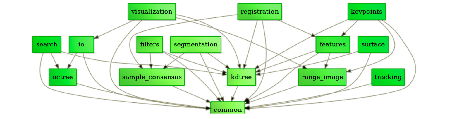 - 为了简化开发,将PCL分为一系列较小的代码库,可以分别进行编译。