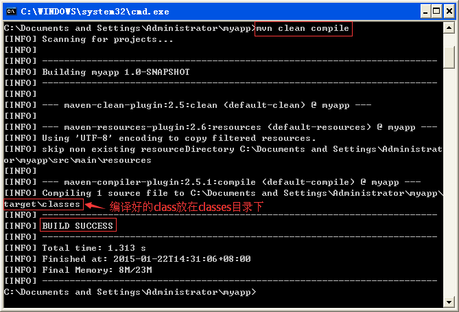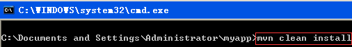编译源程序,进入命令行,切换到myapp目录,执行命令:mvn clean compile,如下图所示: