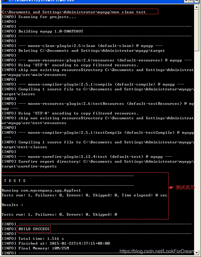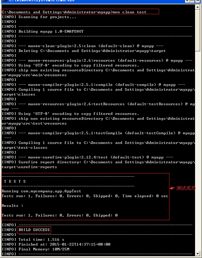 进入命令行,切换到myapp目录,执行命令:mvn clean test,如下图所示: