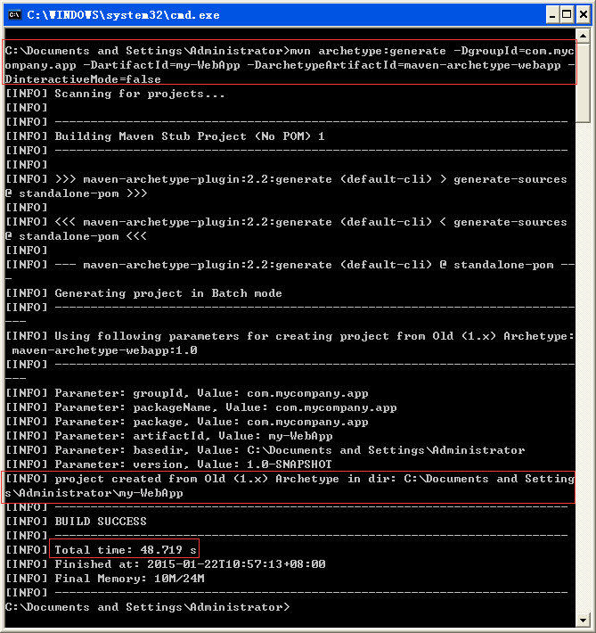 使用"mvn archetype:create"命令创建一个javaWeb项目的时间非常快,几秒钟就可以了。