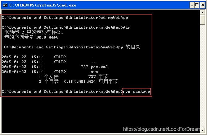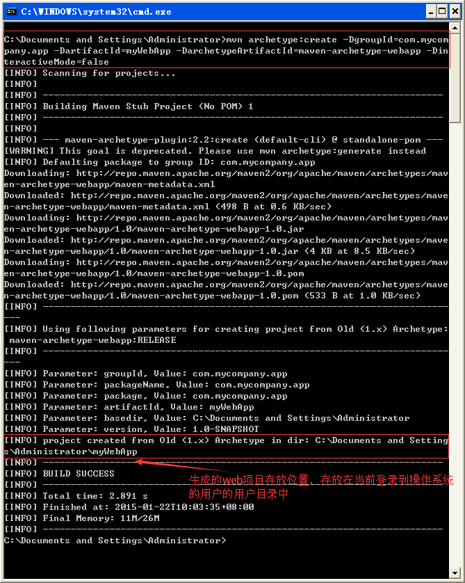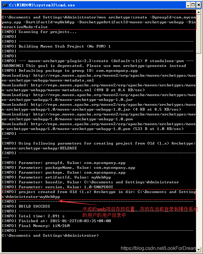 使用"mvn archetype:create"命令创建一个javaWeb项目的过程如下图所示: